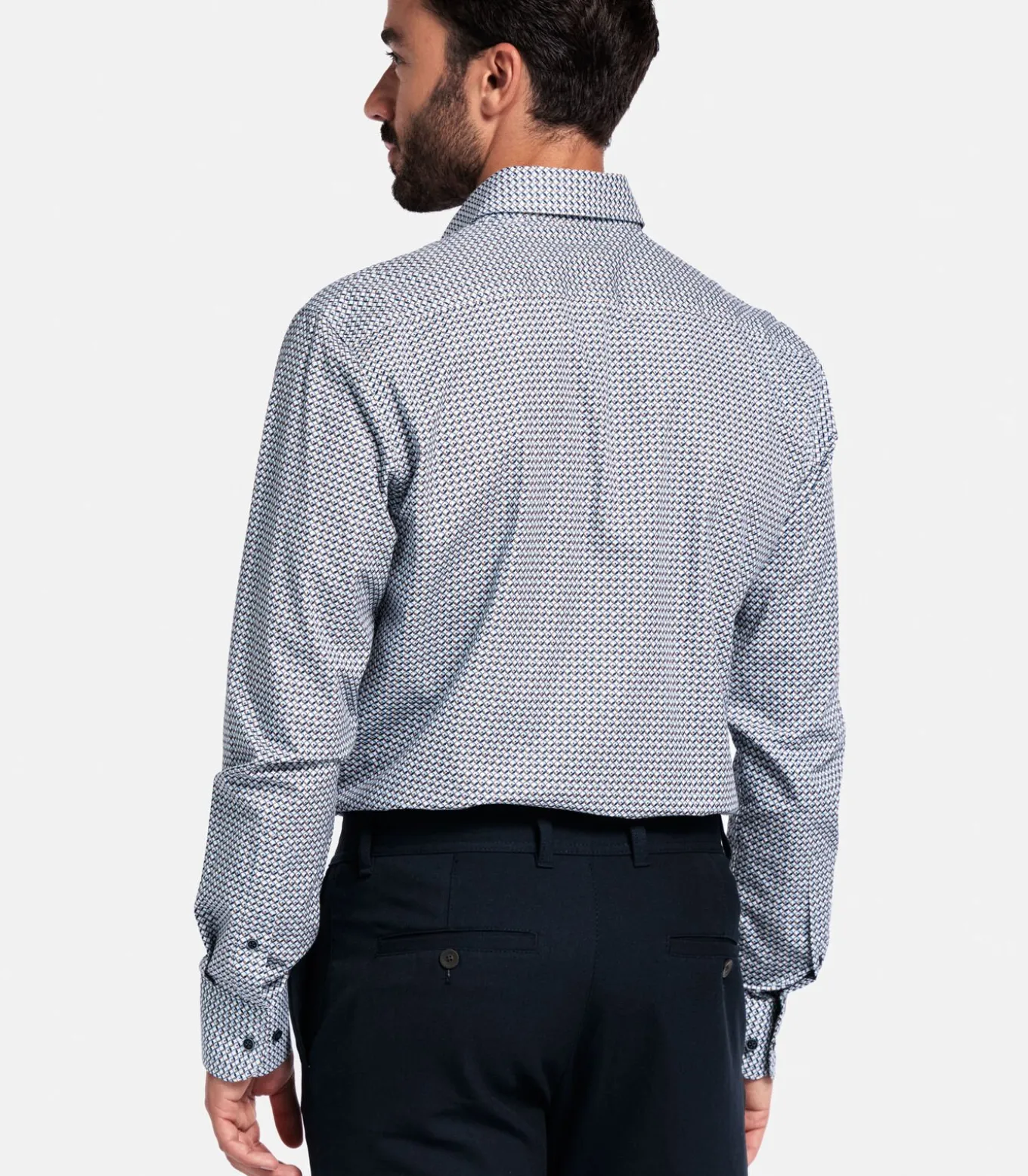 Dit overhemd met lange mouwen is uitgevoerd in een regular fit en gemaakt van satijnkatoen met stretch. De grafische print geeft het model een moderne en verfijnde uitstraling, terwijl de soepele stof zorgt voor optimaal draagcomfort en bewegingsvrijheid. Afgewerkt met een button–downkraag voor een verzorgde look. Artikelnummer 527020–60