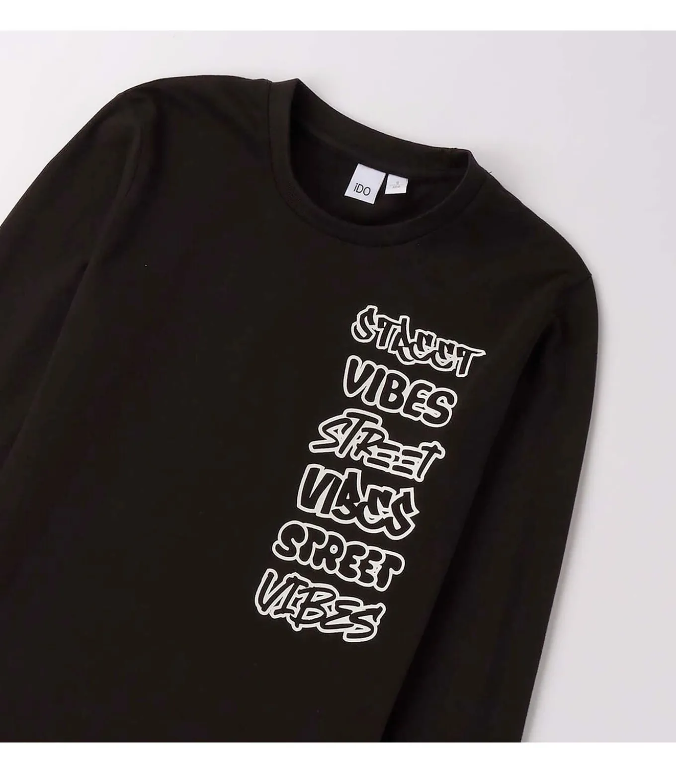 Kleur: Zwart Samenstelling: 100% Katoen Mouwen: Lang Halslijn: Ronde hals Details: T–shirt voor jongens van 8–16 jaar van perzikkleurige katoenen jersey, verrijkt met Street Vibes–opdruk op de voorkant voor een urban en modern karakter. Gebruik: Perfect voor casual en streetwear looks, ideaal voor school en vrije tijd.