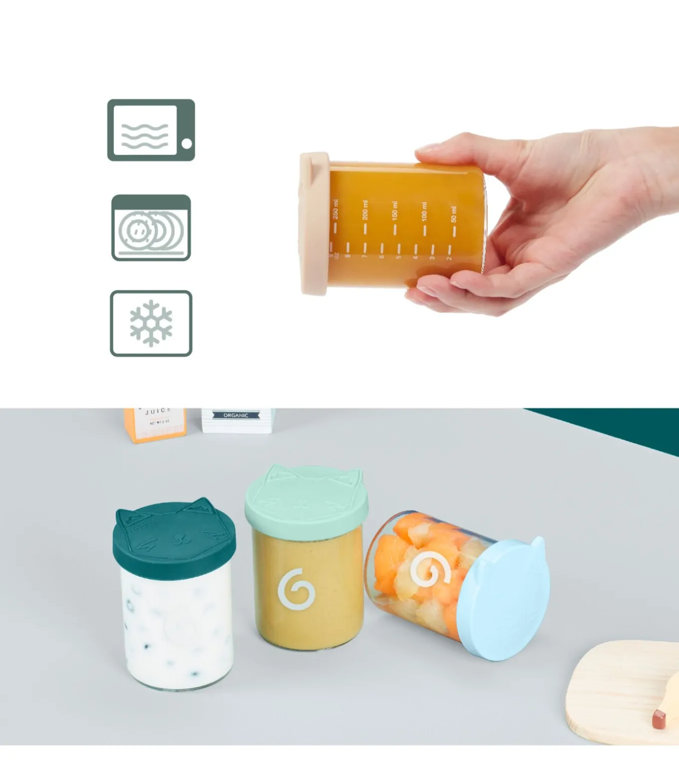 Bestand tegen zeer hoge temperaturen & thermische schokken 100% luchtdicht siliconen deksel Nauwkeurige graduatie Stapelbare potten voor optimale opslag Geschikt voor magnetrons, dubbele boilers en flessenwarmers Kan worden gesteriliseerd