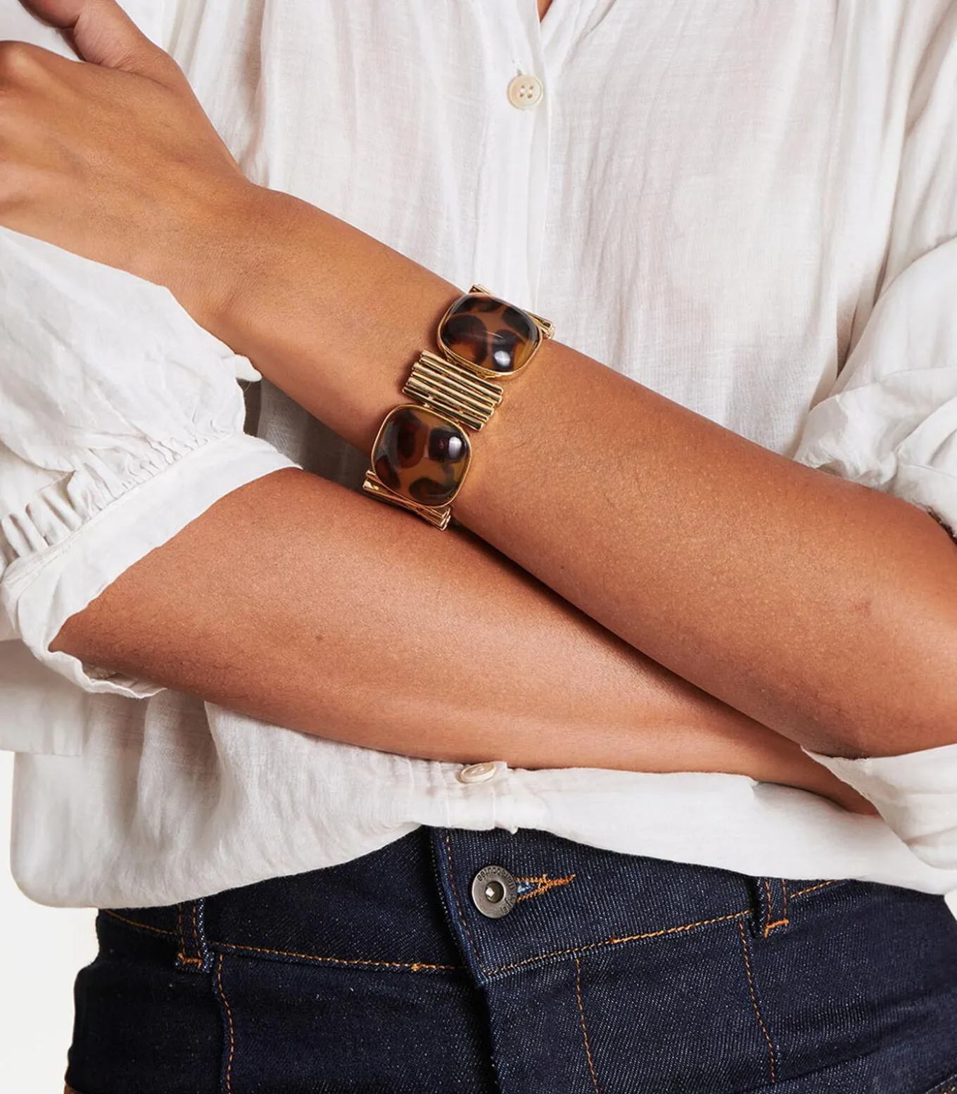 – Elastische armband met verguld metaal en tweekleurige hars in goud en bruin