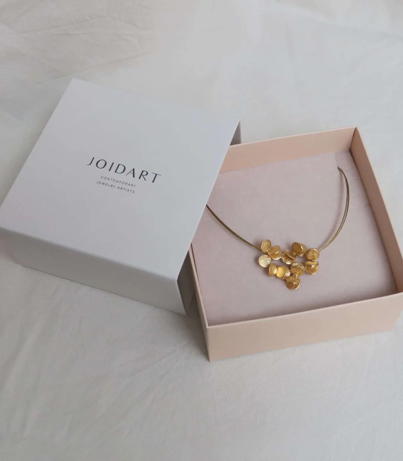 Choker van mat, met de hand bewerkt metaal, verguld met 24–karaats goud, met glanzende uiteinden. Kleine hanger met een ontwerp van kleine cirkels die elkaar overlappen. Dubbele vergulde stalen ketting. Karabijnsluiting en verlengkettinkje.