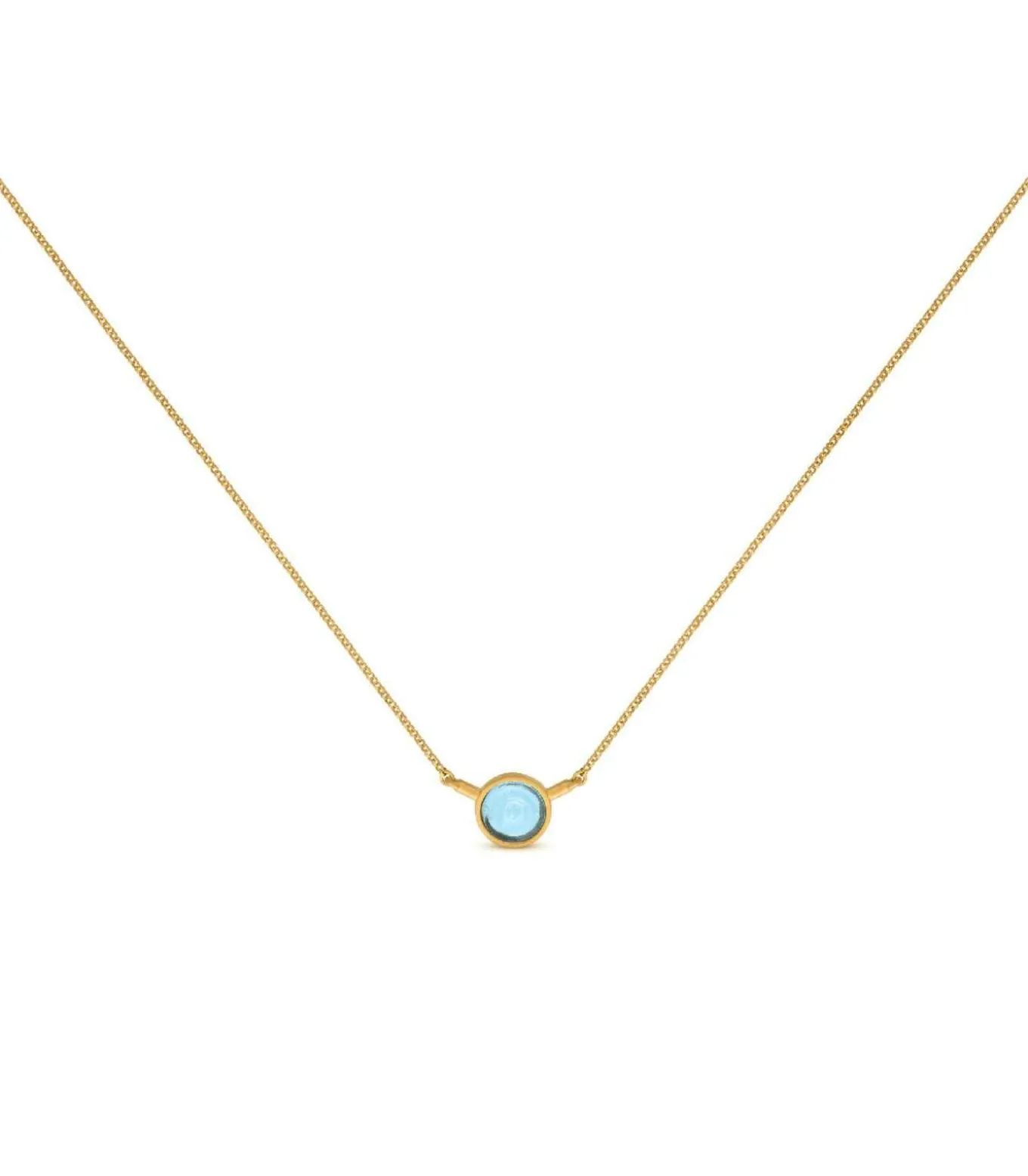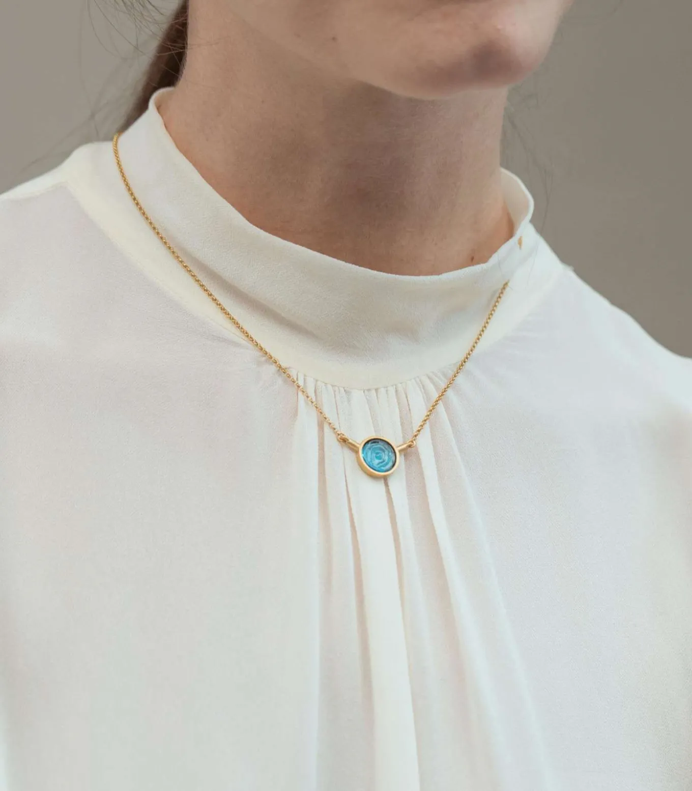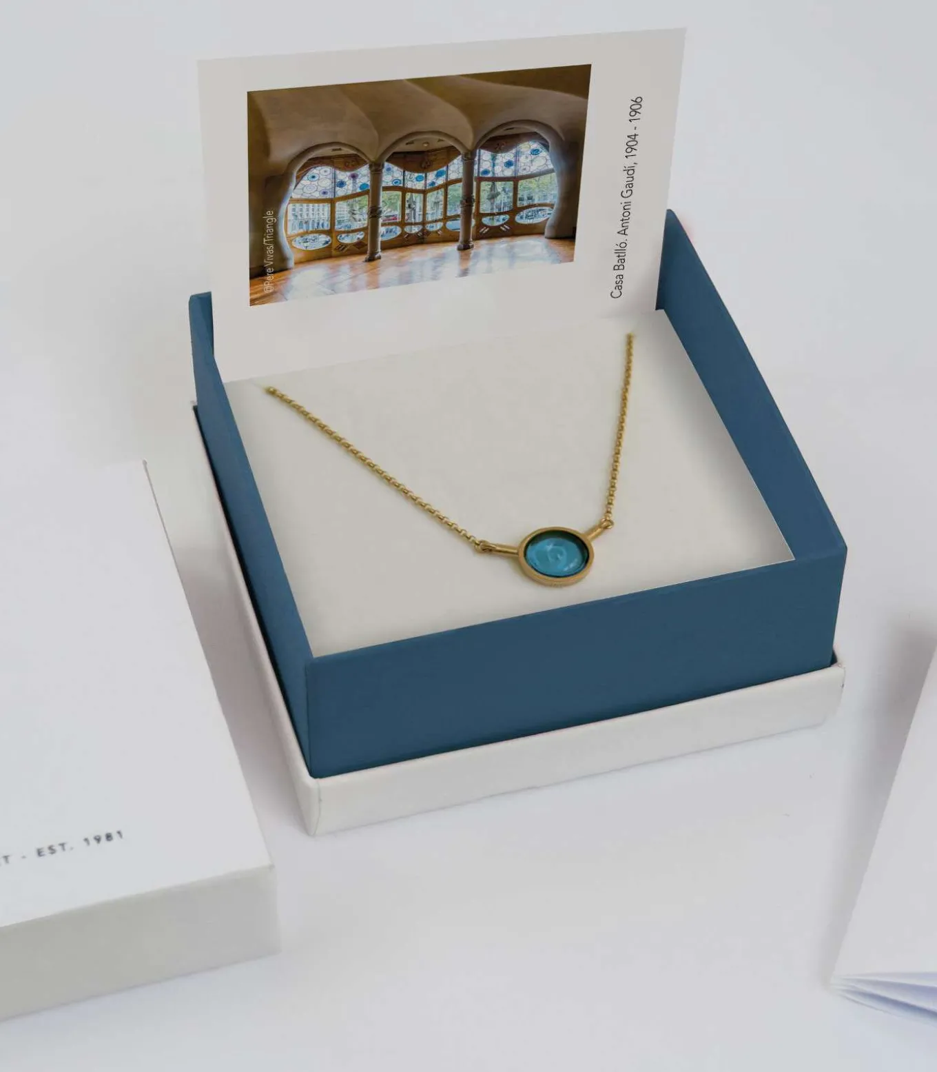 Ketting van met 24–karaats goud verguld mat metaal en een kleine hanger van felblauw handgemaakt Murano–glas. Het ontwerp is geïnspireerd op het glas–in–loodraam van Casa Batlló, ontworpen door architect Antoni Gaudí in 1904 – 1906. Karabijnsluiting en verlengkettinkje.