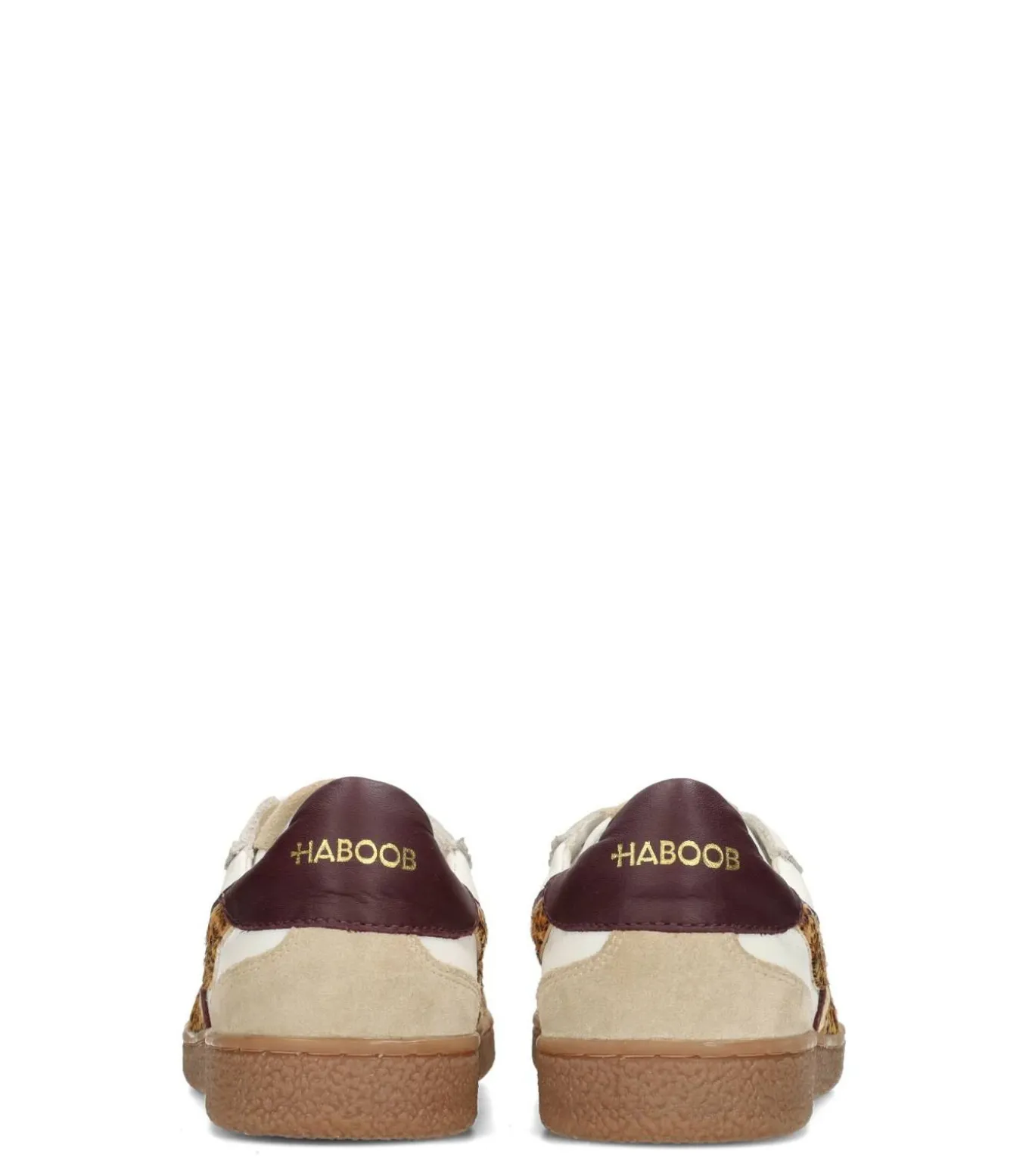 Deze trendy POLARO sneaker voor Dames van HABOOB heeft een bovenwerk van leer en suède in de kleur beige met panterprint details. Het model is voorzien van een vetersluiting met veters en heeft een comfortabele hak met een hoogte van 5 cm. De sneaker heeft een binnenvoering van leer en stof combinatie met een uitneembaar voetbed.