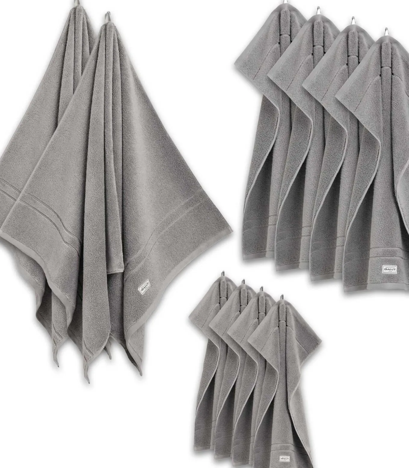 Effen badstof serie met logopatch van het merk GANT. Set bestaande uit 2 douchehanddoeken, 4 handdoeken en 4 gastendoekjes. Extra donzige kwaliteit van biologisch katoen.