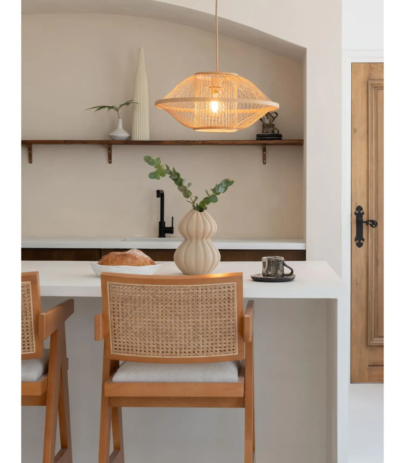 Hanglamp Maui naturel brengt de tropische charme van het eiland Maui in huis. Met zijn handgemaakte ontwerp van ronde bamboelatjes in een verfijnde spiegelstructuur, roept deze lamp de vloeiende kustlijnen en weelderige natuur van Maui op. De naturel kleur voegt warmte en diepte toe, terwijl het bamboe zorgt voor een authentieke uitstraling. Of de plafondlamp nu boven de eettafel hangt of een knus hoekje verlicht, hanglamp Maui straalt een onweerstaanbare mix van elegantie en tropische flair uit. Perfect om elke ruimte een stijlvolle, warme sfeer te geven. Eenvoudig te monteren met het bijgeleverde plafondsysteem.