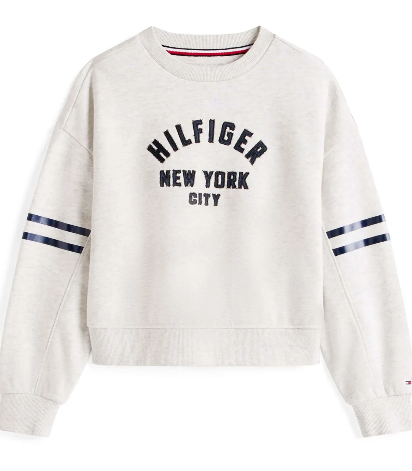 Kleur: Grey Heather. Samenstelling: 68% katoen, 32% gerecycled polyester. Mouwen: lang. Halslijn: ronde hals. Pasvorm: relaxed fit. Details: gestreepte details op de mouwen, geribbelde kraag/manchetten/onderkant, signature tape in de nek, applicatie met Tommy Hilfiger NYC–logo op de voorkant, geborduurde vlag op de mouw. Duurzaamheid: bevat gecertificeerd gerecycled polyester. Gebruik: een must–have in collegestijl, perfect voor casual en comfortabele looks.