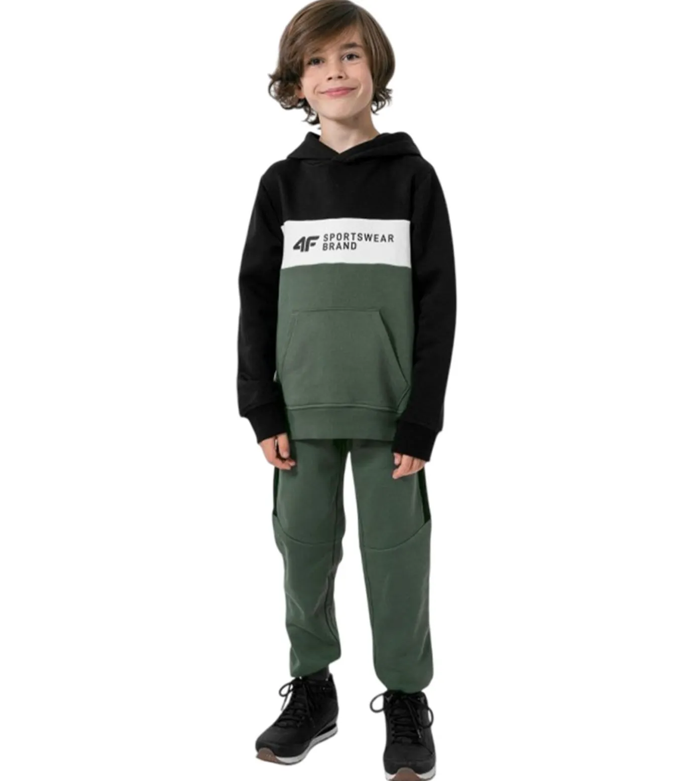 4F, HJZ22 JBLM003 46S – Zwarte Sjorte met kap, gemaakt van 100% katoen met geborsteld stof. Dit ontwerp is een kleurblokontwerp, bedrukt met logo en tekst. De kraag is dubbelzijdig, de halslijn is kapitein en de mouw heeft lange mouwen. De manchet heeft ribbel. Het hemd bevat 1 kangoeroezak en wordt aan de achterkant vastgehouden. De passingsmaten zijn geschikt voor 8–9 jaar (26 inch) en 10–11 jaar (28 inch).
