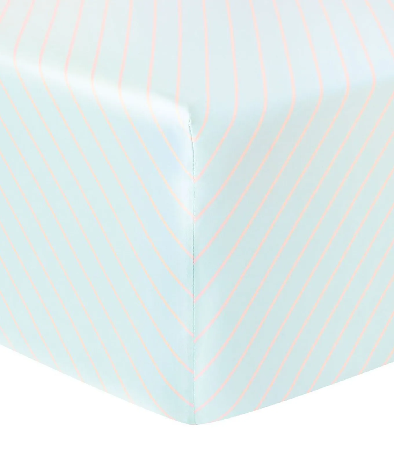 Diagonale streepprint op een lichtgroene achtergrond.Hoeslaken met een hoogte van 35 cm.