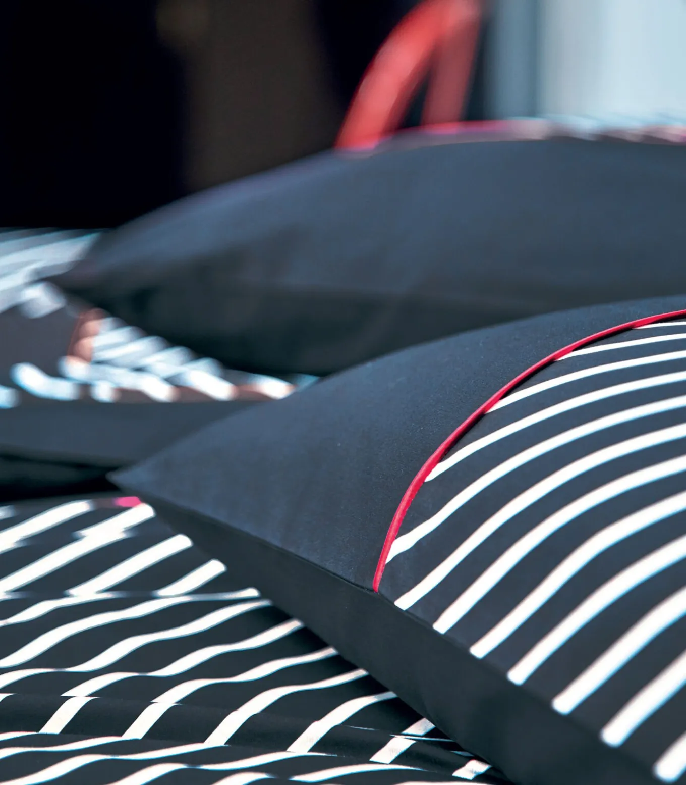 “Door samen te werken met het jeansmerk 1083, hebben we ervoor gekozen om de iconische keperstreep, zo kenmerkend voor Denim, te accentueren. We hebben het in twee kleuren afgewezen: Indigo en Mousse en geaccentueerd met een biezenafwerking. rood, de emblematische kleur van deze jonge merk.Deze items worden geweven, geverfd, bedrukt en gemaakt in de Vogezen.”