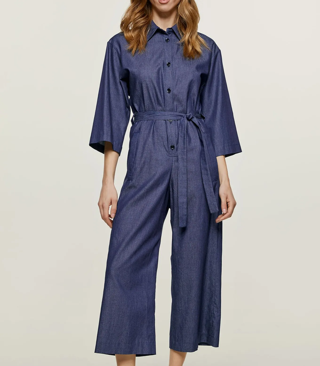 Deze indigo jumpsuit is gemaakt van katoen. Het heeft ¾ mouwen en een kraag. Er is een halssluiting met zwarte plastic knopen. Er zijn zakken aan de zijkanten met elk een riemlus. Het heeft een 3 cm brede ceintuur van dezelfde stof die door twee ceintuurlussen in de taille loopt. Aan de achterkant zit een omgekeerde plooi. De jumpsuit heeft een beenlengte van 7/8.