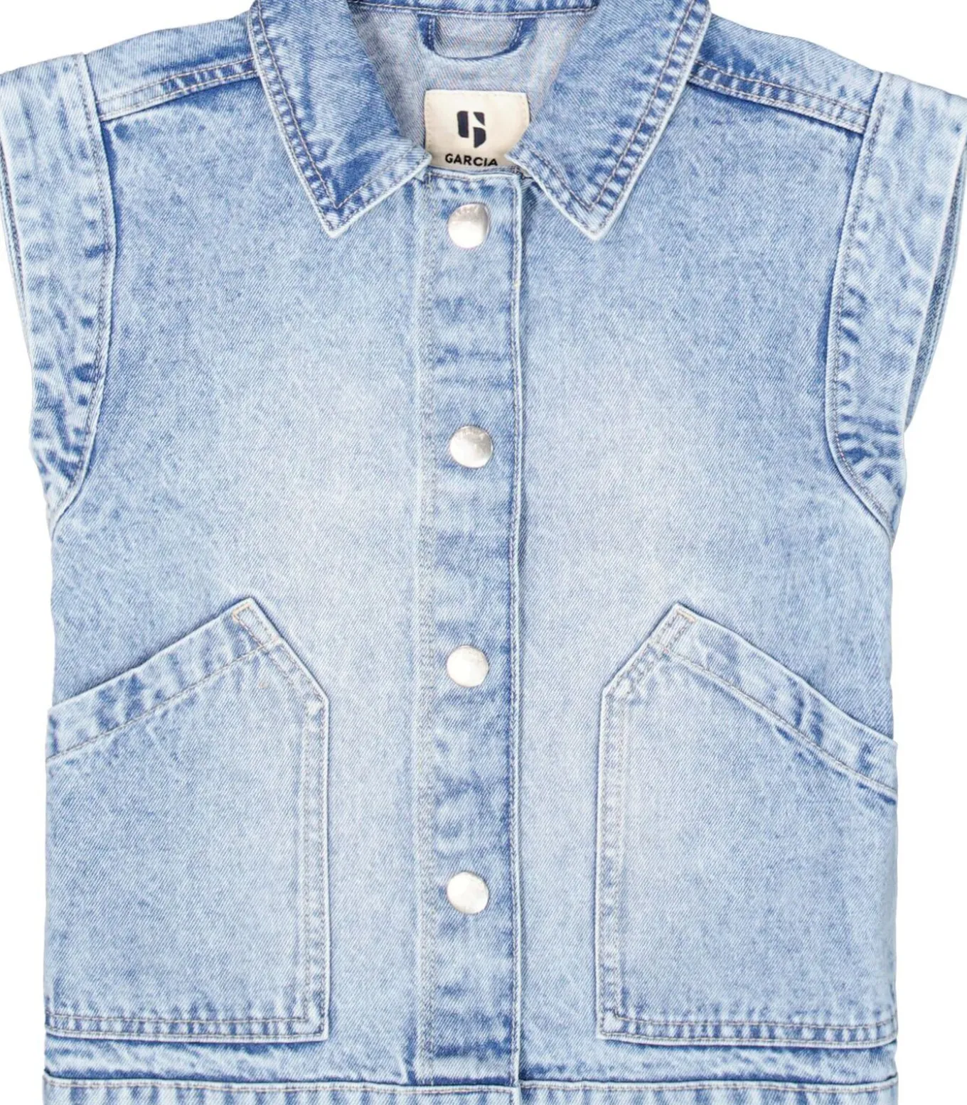 Gilet met denimlook. Met dit item creëer je gemakkelijk een toffe outfit. Dit gilet heeft een drukknoopsluiting, een opstaande kraag en een generous fit. Dit item is gemaakt van 80% katoen en 20% recycled katoen.Hergebruik van materialen draagt bij aan een circulaire economie. Bij het creëren van dit GARCIA kledingstuk is gebruik gemaakt van een duurzame wastechniek.