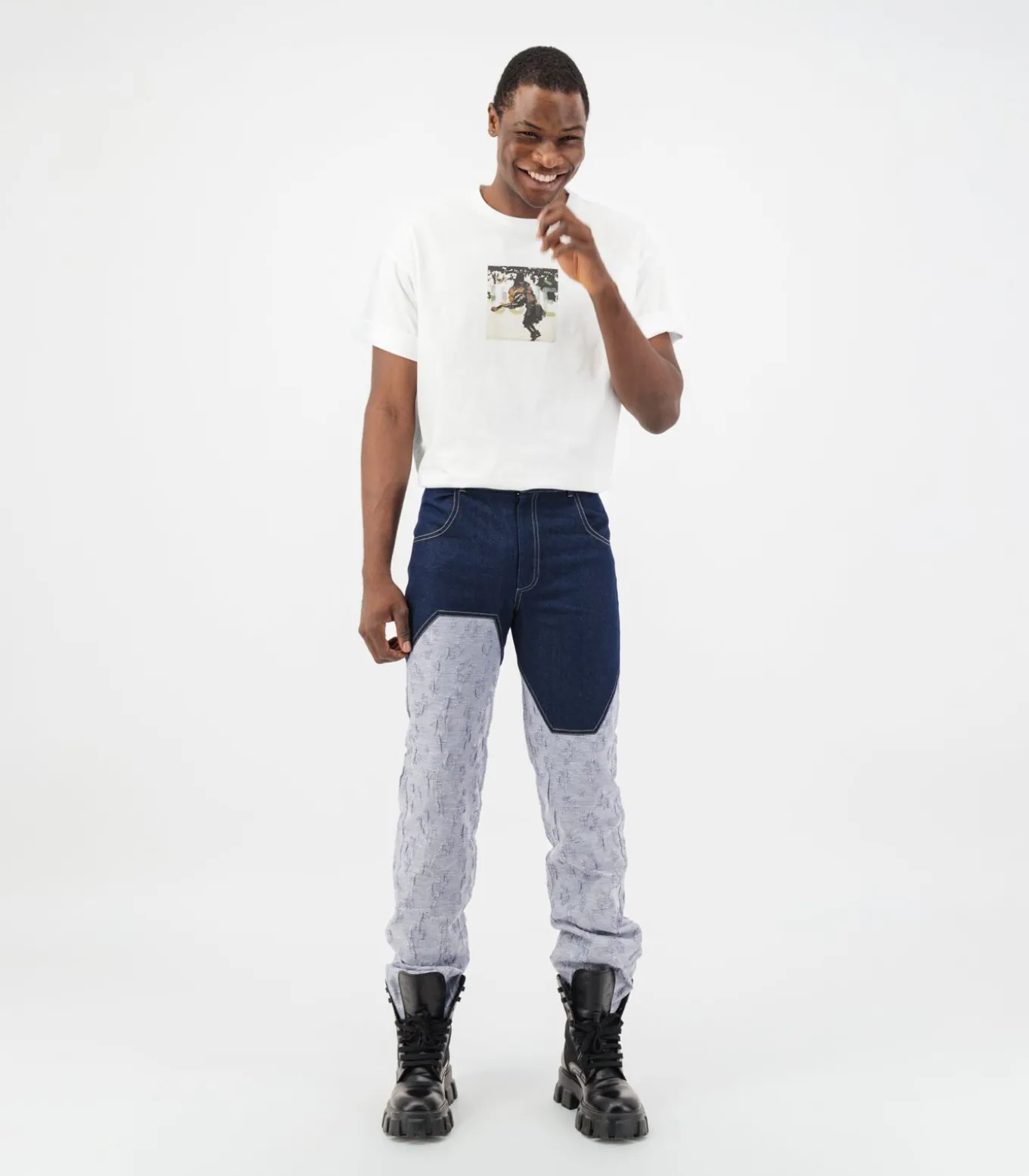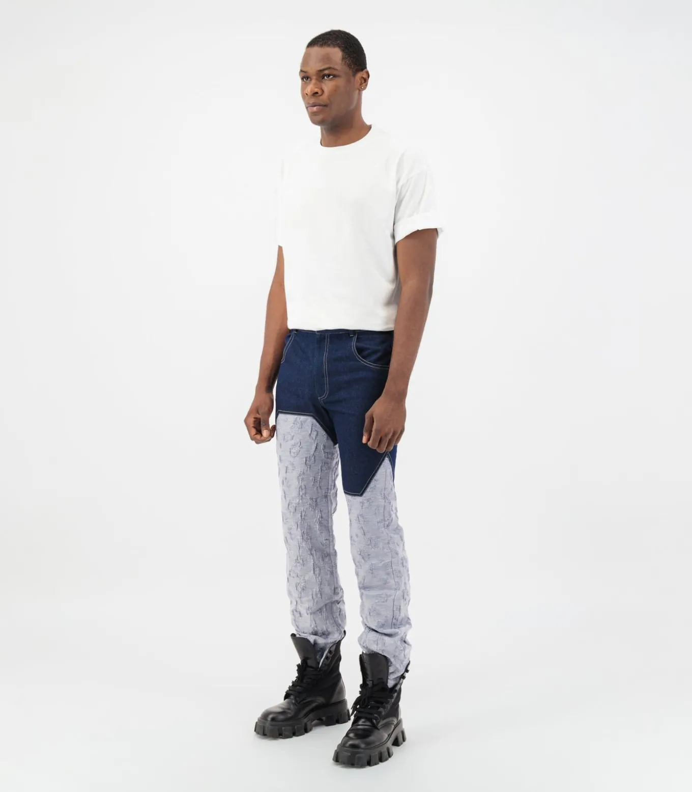 Tweekleurige half donkerblauwe denim en halfblauwe jacquardbroek met reliëf. Voorzakken, riemlussen en verborgen sluiting aan de voorkant.