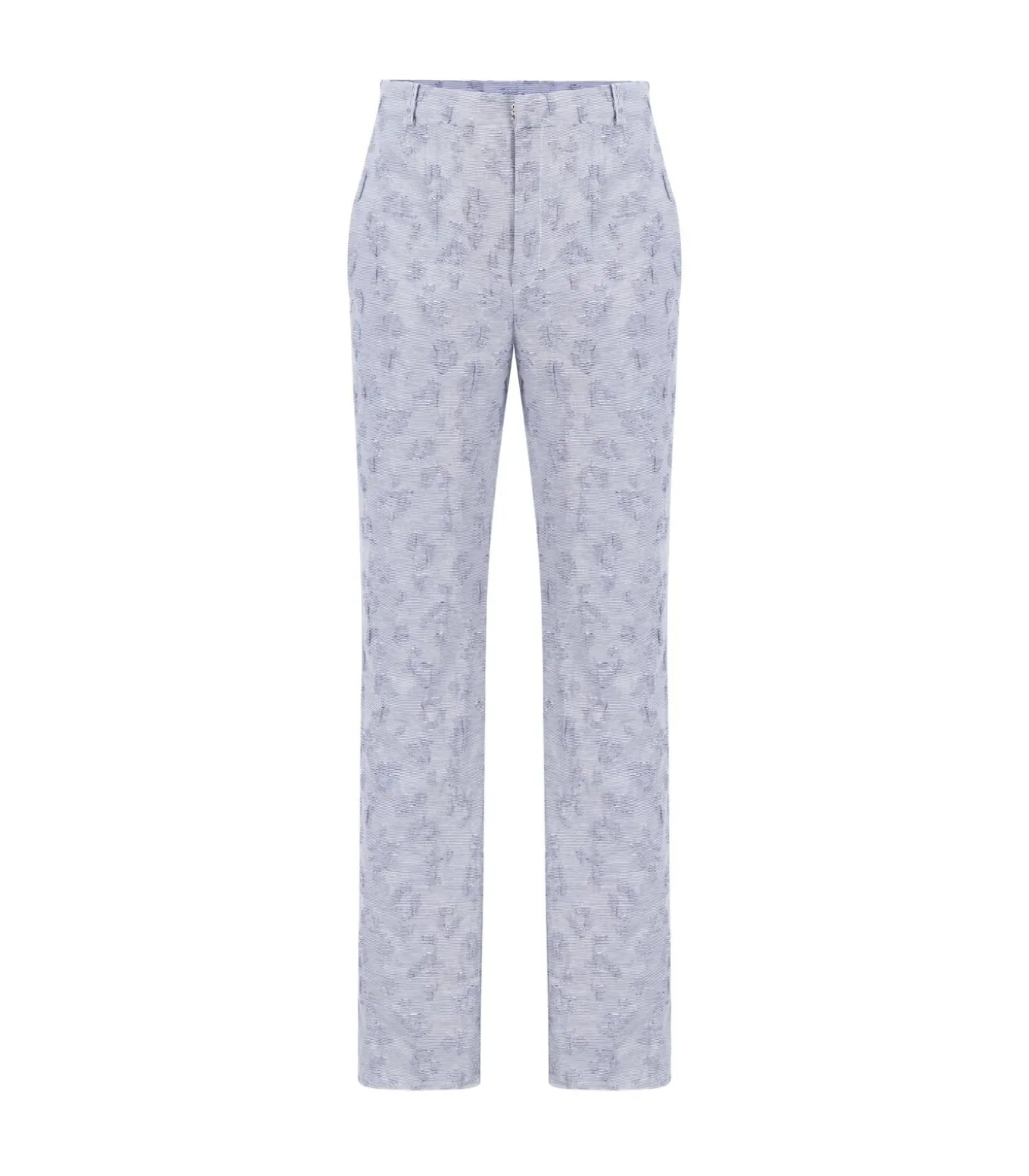 Blauwe jacquardbroek met hoge taille, rechte pijpen, riemlussen, verborgen sluiting en ritssluiting aan de voorkant.