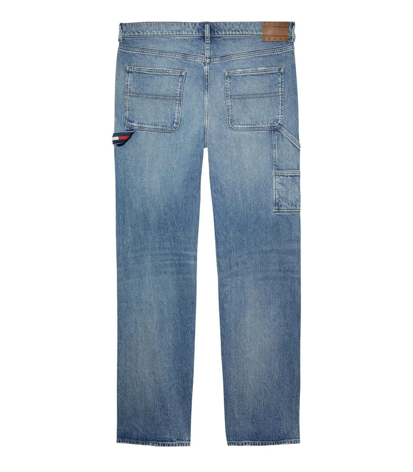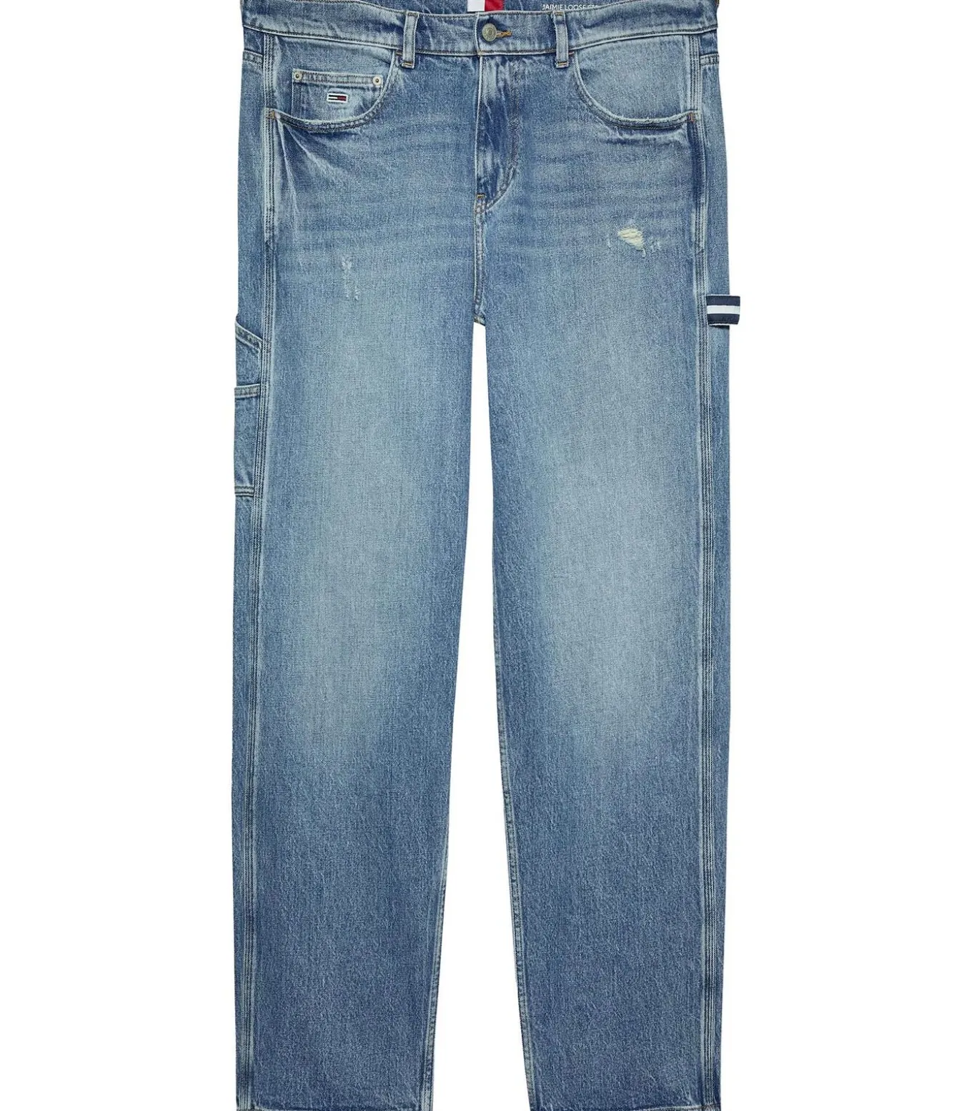 * Kleur: Denim Medium * Lengte: Normaal * Pasvorm: Rechte pasvorm * Sluiting: Rits en knoop * Details: All–over vervaging, kreuken op de dijen en knieën, versleten details op de dijen, gereedschapslus, extra werkzakken, patch Tommy Jeans–vlag op het muntzakje * Gebruik: Ideaal voor een casual street look, perfect te combineren met een t–shirt en sneakers voor een relaxte maar verfijnde stijl.