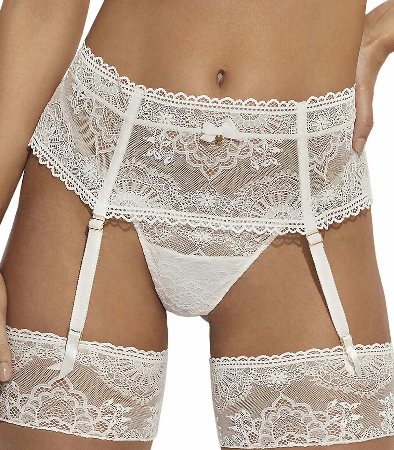 Een verleidelijk stuk kant dat uw trouwoutfit op goddelijke wijze zal completeren. Het is comfortabel om te dragen dankzij een brede elastische tailleband. 4 verstelbare jarretels om uw kousen op hun plaats te houden. Verstelbare achtersluiting.