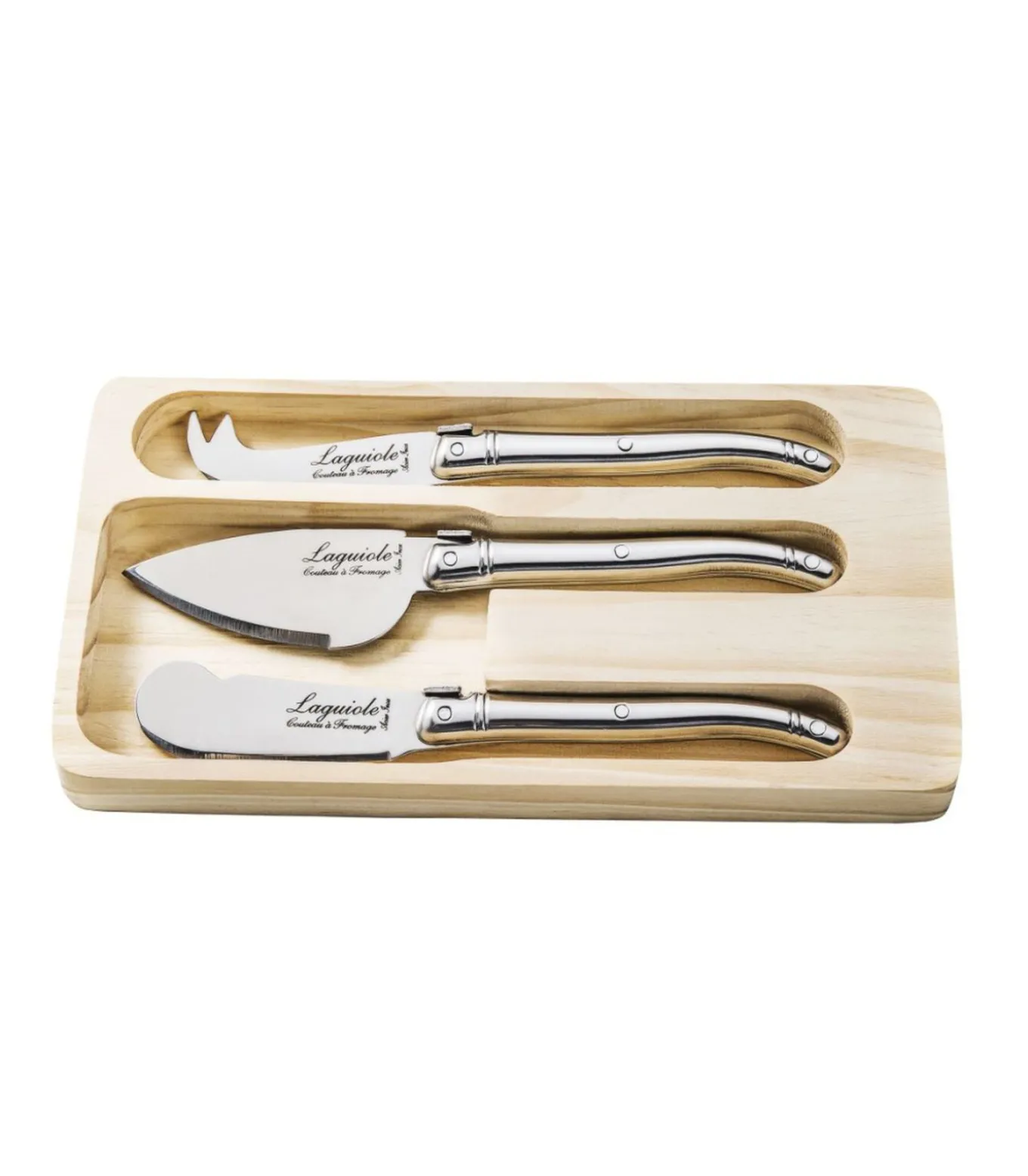 Deze kaasmessenset van Laguiole Style de Vie bestaat uit drie kaasmessen, geschikt voor alle kazen en wordt geleverd in een houten tray. De messen zijn vaatwasserbestendig.