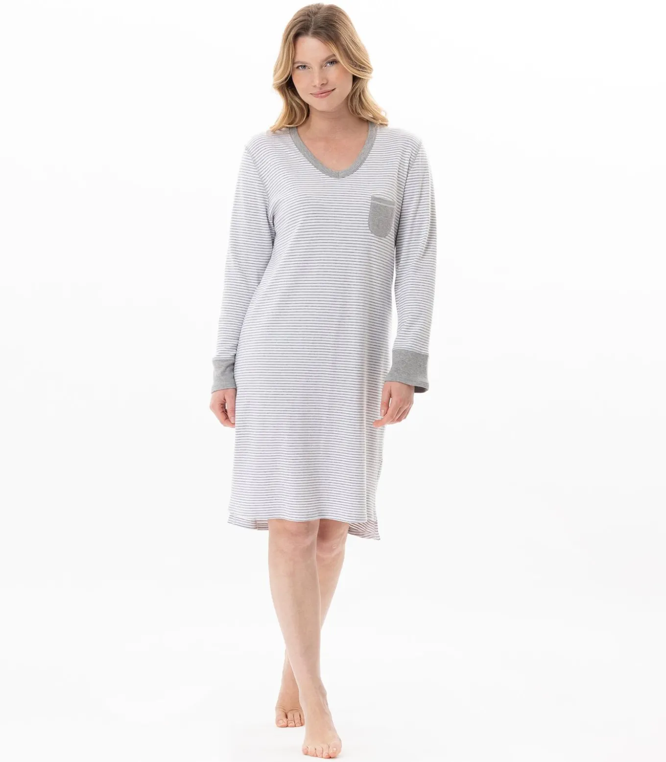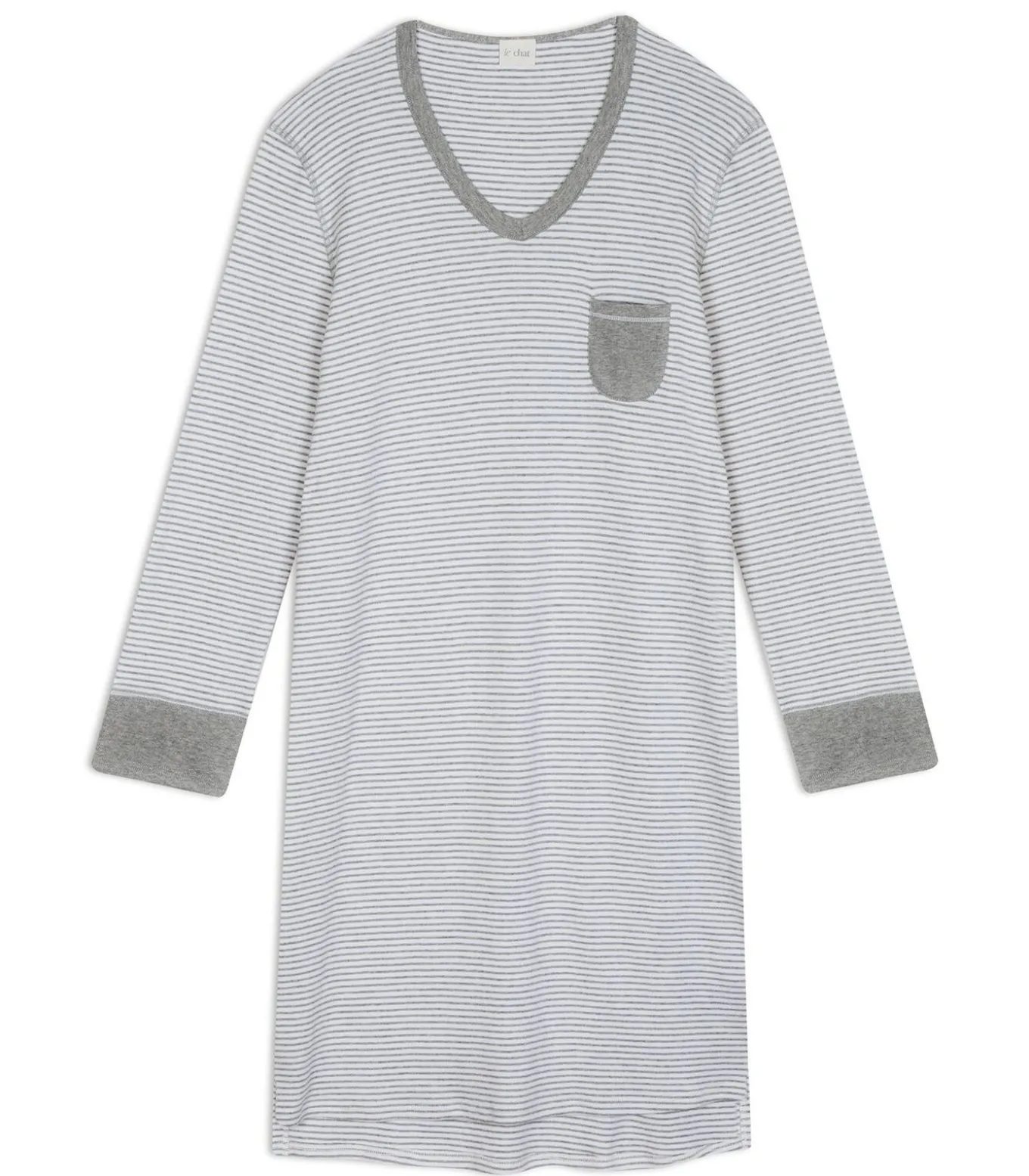 De milleraies–strepen op een gebreide trui zo zacht als een sneeuwvlok en de vloeiende snit: alles wat je nodig hebt om dit een comfortabele essential voor de nacht te maken.