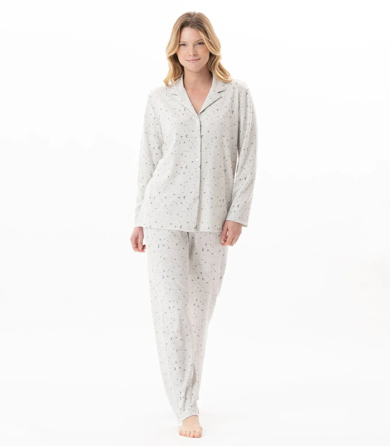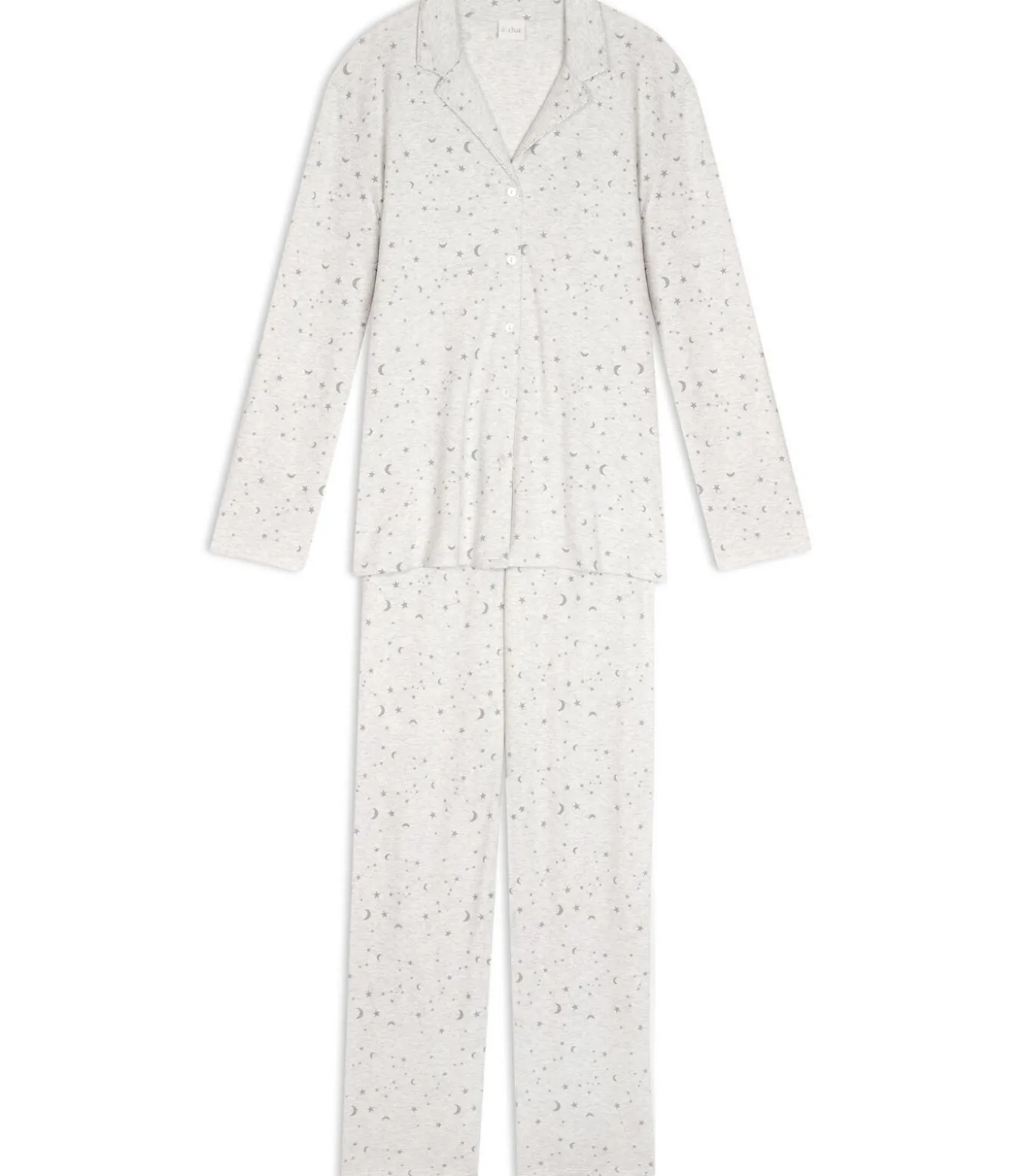 De Luna pyjama met knopen heeft een gemakkelijke opening die vooral handig is bij het geven van borstvoeding, ziekenhuisopnames of gewoon om je moeiteloos aan te kleden. Dit model valt ook op door de zorgvuldige afwerking en de sterrenbeeldprint van de Grote Beer, die een dromerige touch toevoegt aan rustige nachten. De Luna pyjama met knopen is verkrijgbaar in twee uitvoeringen: een gouden print op een ecru achtergrond of donkergrijs op gemêleerd grijs. Maak je nachtkleding compleet met een kamerjas, badjas of een onmisbaar jasje om je warm te houden als je uit bed stapt.