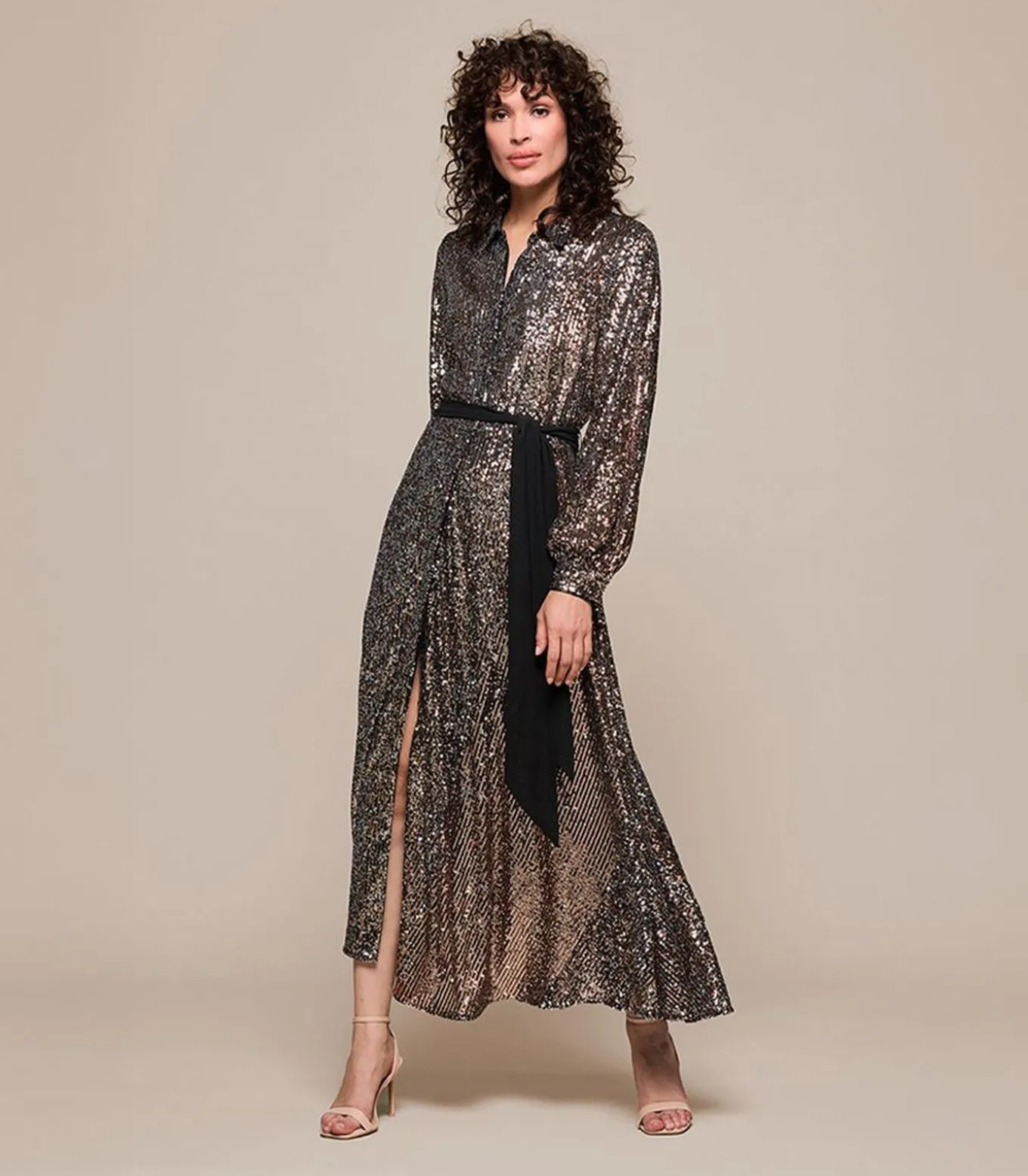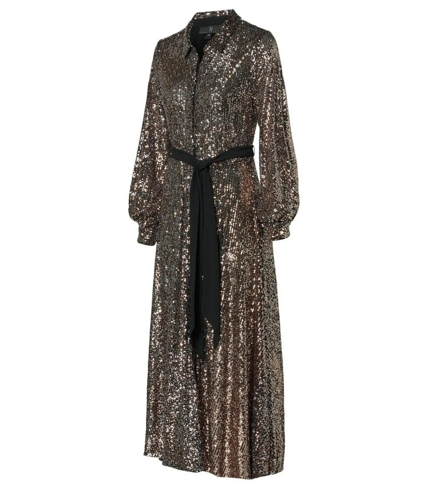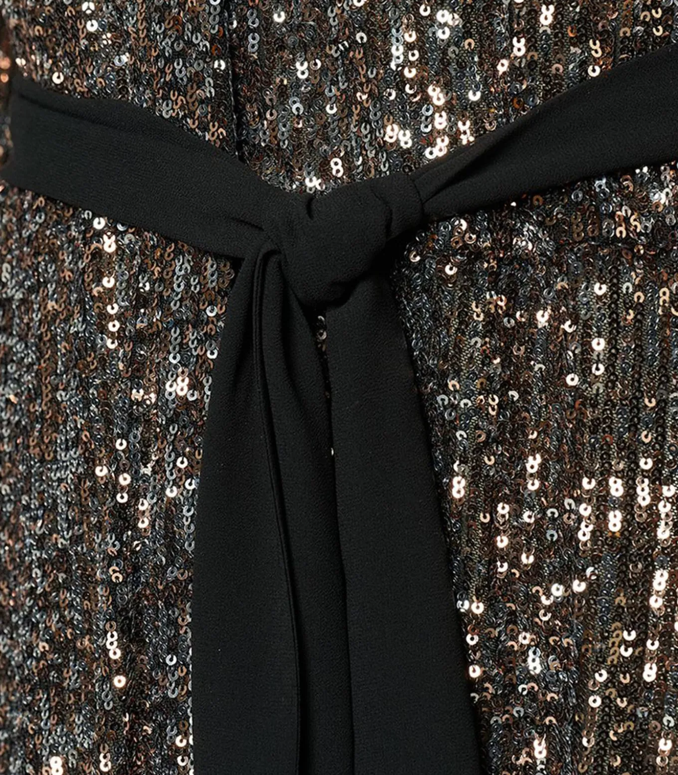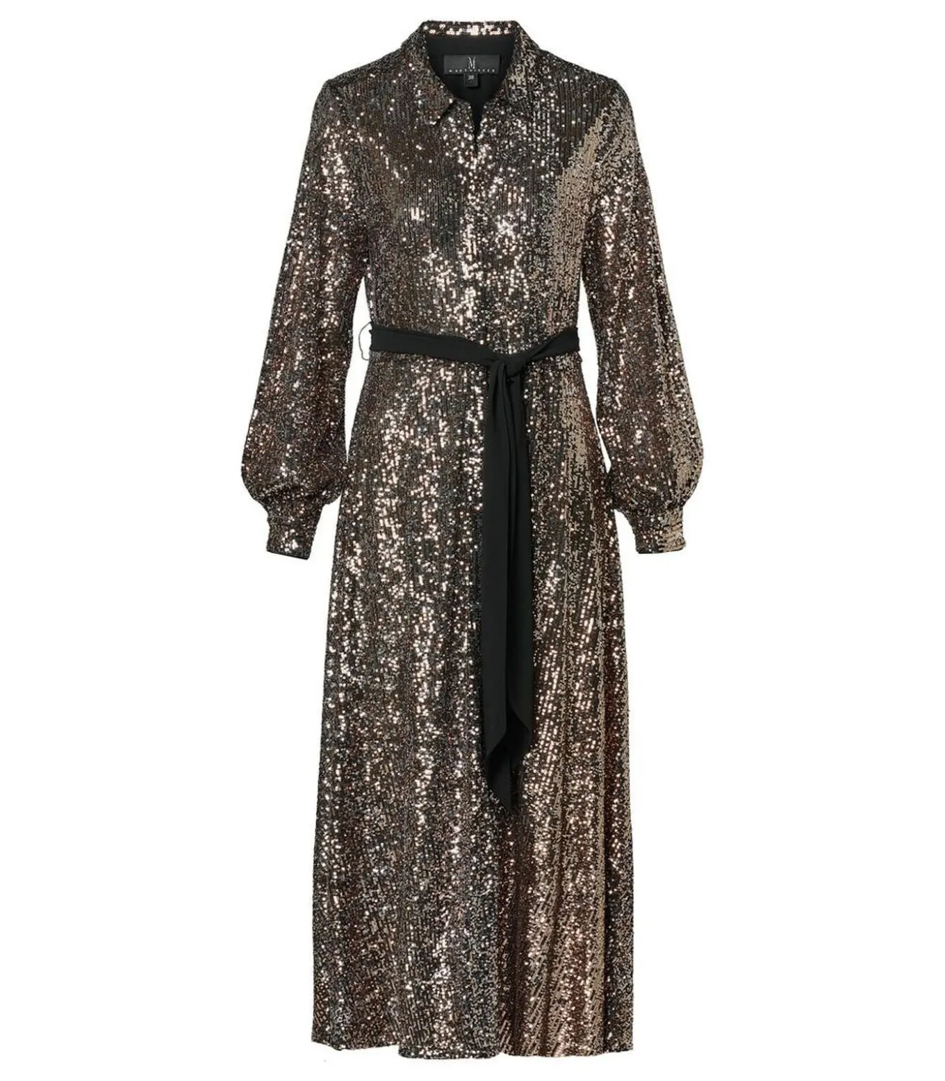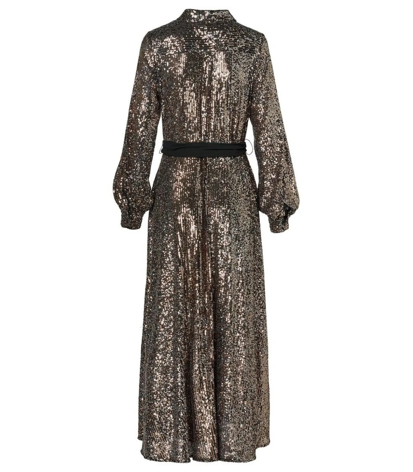 De Kelly paillettenjurk in brons is een schitterende blikvanger die luxe en warmte uitstraalt. De jurk is volledig bezet met fonkelende bronzen pailletten op een diepe donkerbruine ondergrond, wat een rijke en elegante uitstraling geeft. De reverskraag en de lange mouwen met subtiel pofdetail bij de polsen zorgen voor een speelse maar stijlvolle touch. Met het zwarte strikceintuur van contrasterende stof kan de taille extra worden geaccentueerd; dit ceintuur is eenvoudig afneembaar voor een andere uitstraling. De blinde knoopsluiting en de losse onderjurk garanderen draagcomfort. Het kuitlange model met wijd uitlopende rok creëert een elegante beweging bij iedere stap. Een feestelijk ontwerp dat de essentie van Mart Visser’s Haute Couture weerspiegelt: stijlvol, krachtig en tijdloos.
