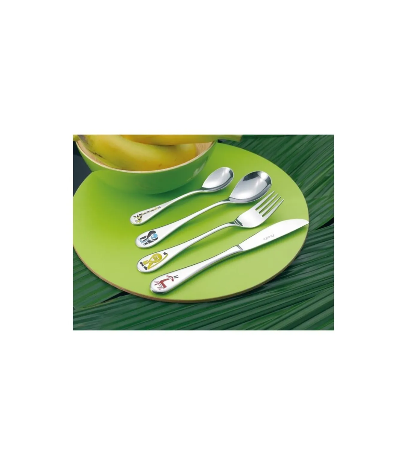 Amefa biedt u een breed scala aan bestek modellen en bijbehorende producten zodat u bij elke gelegenheid de juiste sfeer kunt creëren. Of het nu gaat om een ontbijt met uw familie, een diner met uw vrienden of om een feestelijke barbecue, Amefa heeft een design voor elke gelegenheid of stijl en maakt het alledaags genieten van lekker eten nog aantrekkelijker. De Amefa Kinderbestek Safari 4–Delig bevat: * 1 Kinderlepel * 1 Kindervork * 1 Kindermes * 1 Toetjeslepel De 4 delige Safari kinderbestekset Safari is speciaal bedoeld voor jonge kinderen, die trots kunnen zijn op hun eigen bestek. De set bestaat uit mes, vork, lepel en toetjeslepel, alle delen hebben een vrolijke afbeelding van een dier. De normaal scherpe delen van het mes en de vork zijn afgerond zodat de het veilig te gebruiken is voor de kleine tafelgenoot. De set wordt geleverd in een vrolijke en kleurrijke cadeau verpakking. Kwaliteit staat bij Amefa hoog in het vaandel. Deze 4–delige kinderbestekset is met grote zorg en precisie vervaardigd en is gemaakt van hoogwaardig chroomstaal. Dit product is vaatwasmachinebestendig, voor onderhoudstips zie de verpakking of de website van Amefa. De producten van Amefa staan garant voor jarenlang plezier.