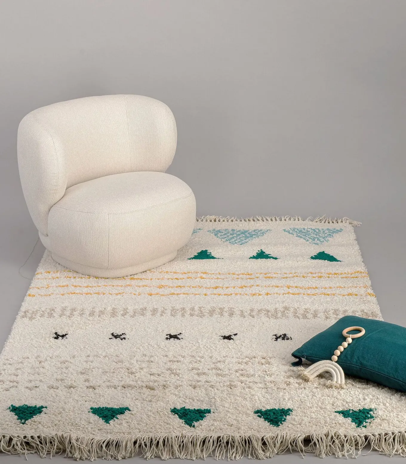 Een uniek tribal–geïnspireerd designtapijt met een trendy kleurenpalet dat de kinderkamer zal opfleuren. AFK Living vloerkleden gemaakt van polypropyleen – ook wel synthetische wol genoemd – hebben een zeer solide en robuuste afwerking. Zelfs bij intensief gebruik behoudt het oppervlak van dit vloerkleed zijn design, kleuren en hetzelfde zachte gevoel. Gemakkelijk schoon te maken, waterafstotend, antistatisch en antibacterieel, het is een ideale vezel voor tapijten. Dit vloerkleed is Oeko–Tex Standard 100 gecertificeerd en het bijbehorende ‘Confiance Textile’–label staat synoniem voor verantwoorde textielproductie. Het garandeert ook dat de vloerkleden vrij zijn van alle schadelijke producten Gemakkelijk te onderhouden, dit kindertapijt is zeer comfortabel en natuurlijk geluiddempend. < / Geweven vloerkleed. Anti–mijten. Het gebruik van synthetische wol voor een kindervloerkleed is niet triviaal. Tegenwoordig maken weeftechnieken het mogelijk om zachte, pluche en robuuste tapijten te creëren. Bovendien is het gemakkelijk te onderhouden en verkleurt het niet door blootstelling aan licht. Verzorgingstips: – Stofzuigen regelmatig zonder wrijven om stof en andere droge deeltjes van het tapijt te verwijderen – Gebruik geen harde borstel – Trek niet aan overtollige draad, maar knip deze af met een schaar – Behandel de vlekken met een licht vochtige doek of spons met water en een beetje neutrale zeep. Materiaal: 100% polypropyleen