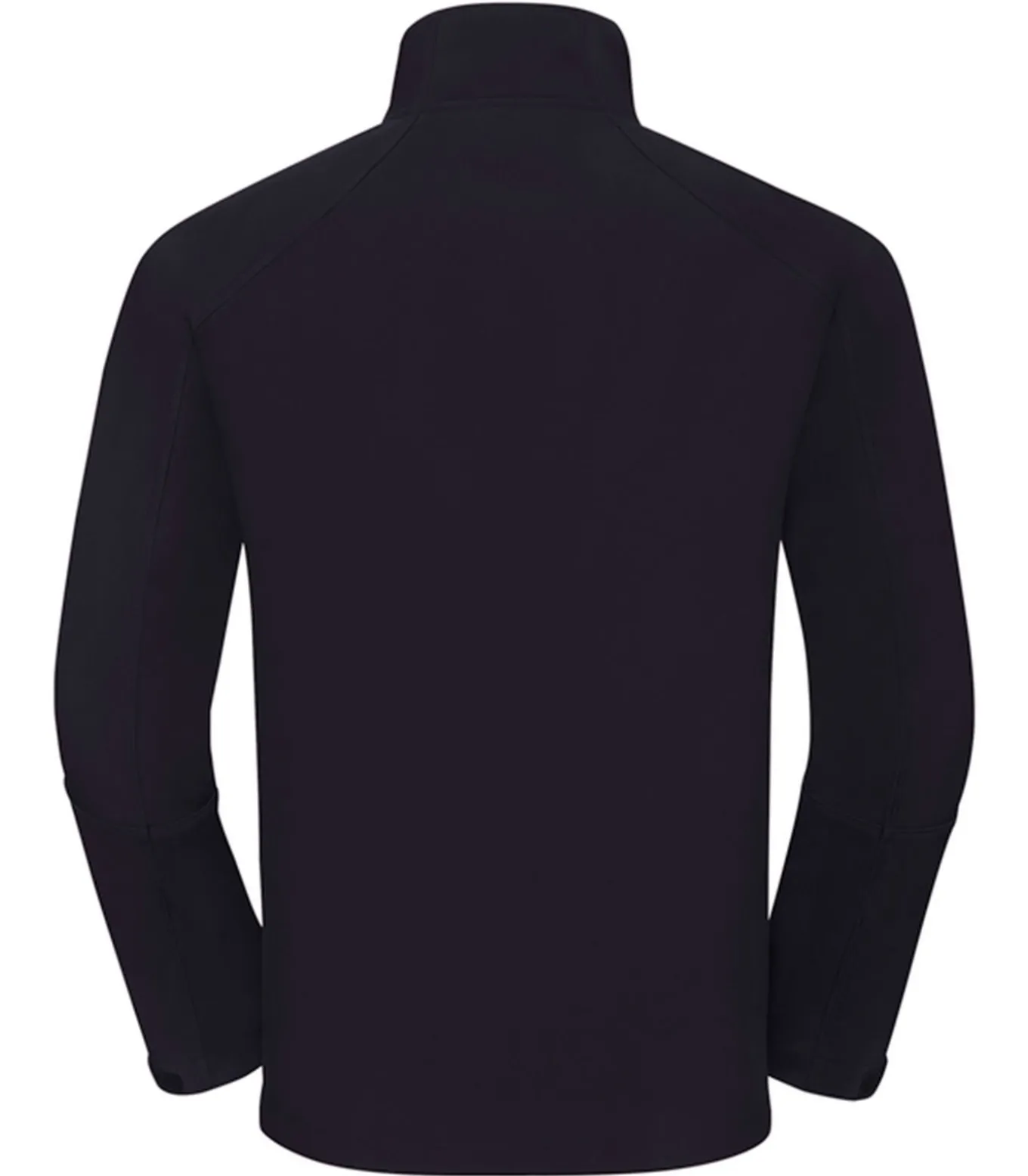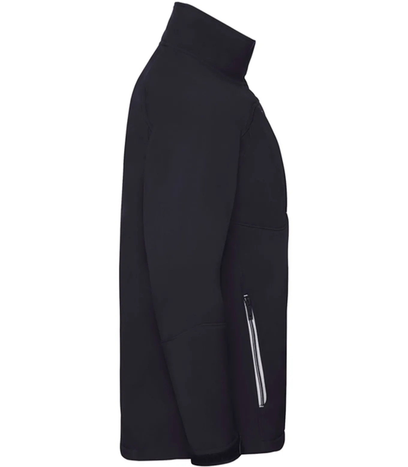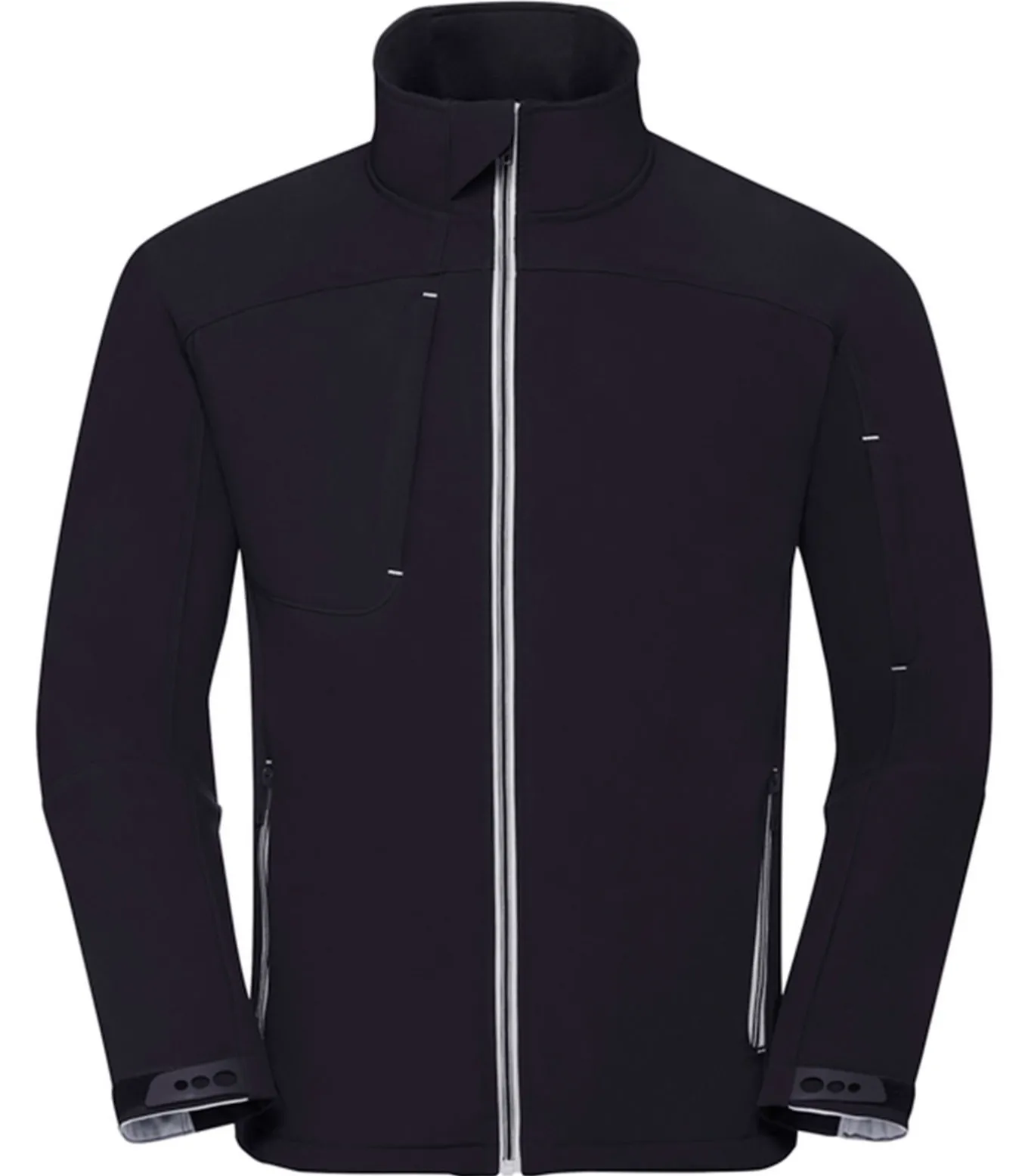 Russell, Klassiek Zwarte Jacket – 94% Polyester en 6% Elastan. Dit jacket heeft eenvoudig ontwerp met een gewicht van 320gsm en is gemaakt van performance– en softshellstof. Het jacket beschikt over Bionic Finish, Ademend, DWR Finish, Hydrofoob Membraan, PFC–vrij, waterafstotend, waterdicht en winddicht technologie. Deze jackets hebben toegang voor decoratie, kinbeschermer, hydroshell oksel–luchtpanelen, binnenste stormflap en naadloos schouder. Het jacket heeft raglan mouwen met lange mouwen en een staande krag halslijn. De manchetten zijn uitgerust met lipjes en aanraaksluitingen. Het jacket heeft een klassiek paspatroon, twee zijzakken, één borstzak, één mouwzak, ritssluiting, een interne media zak en mesh gevoerd zakken. De contrastende ritssluiting is aanwezig bij voeten uit. Het jacket heeft een waterdichte classificatie van 5000mm en wordt gecertificeerd door Amfori, BSCI, Fair Labor Association en Oeko–Tex Standaard 100. De sizes variëren van XS (36 inch) tot 4XL (50 inch).
