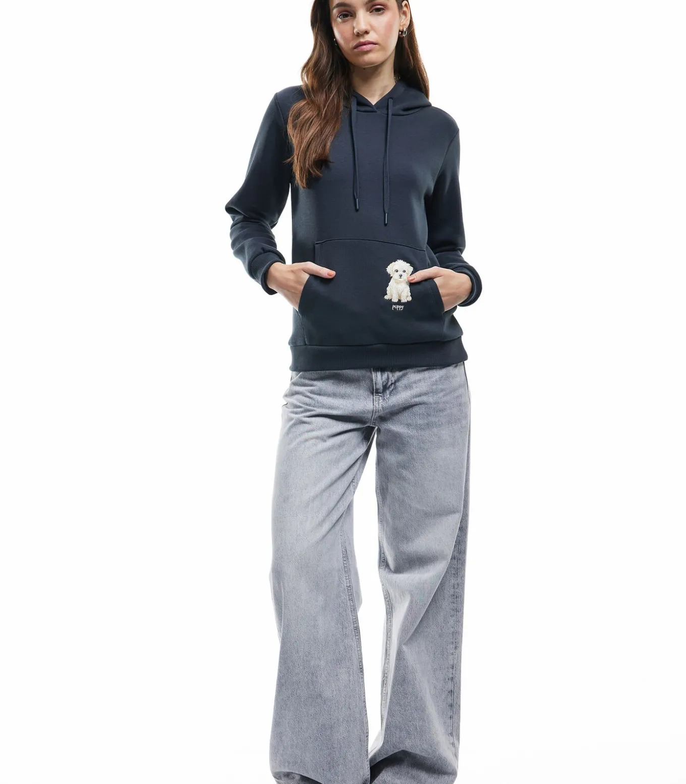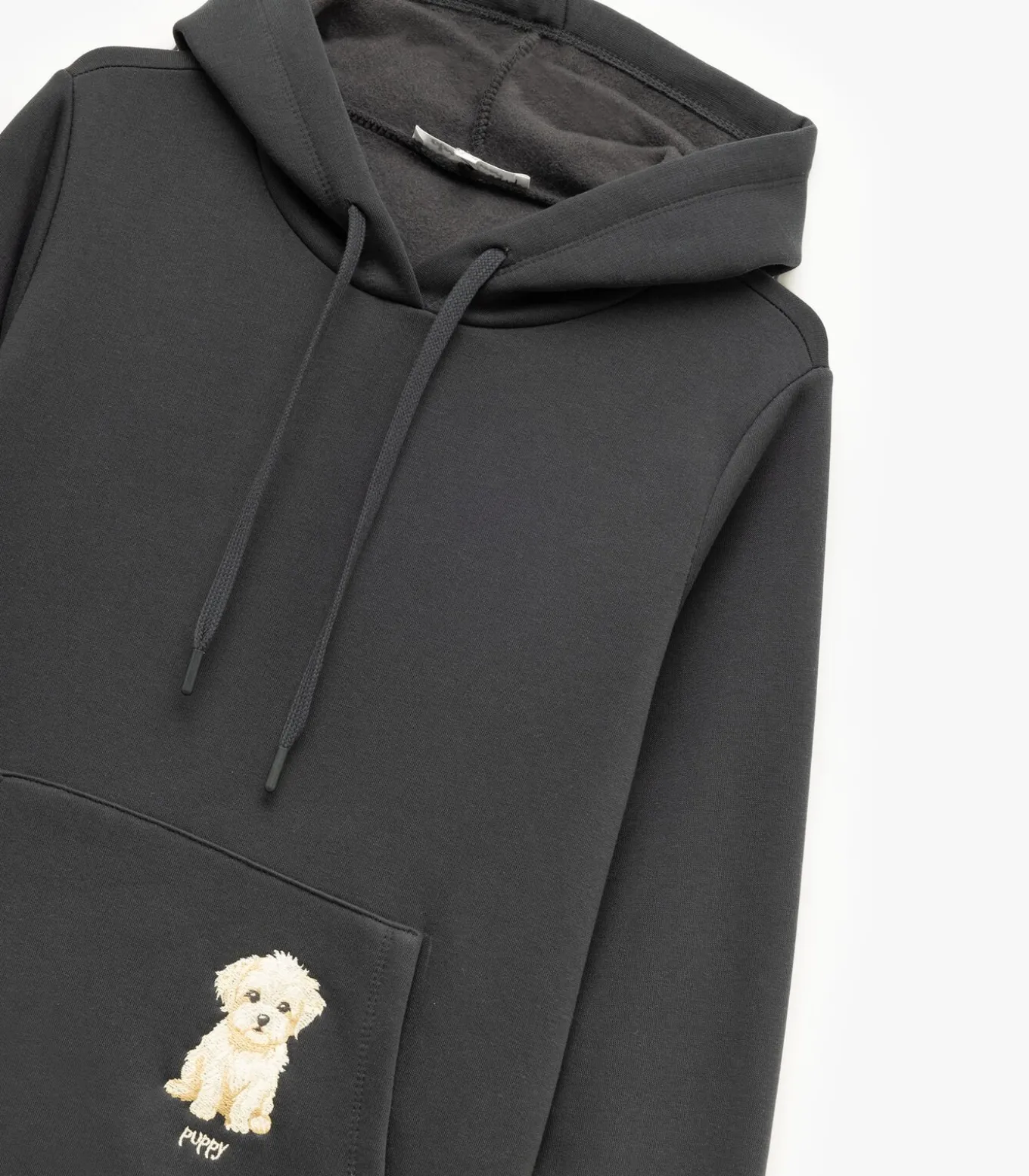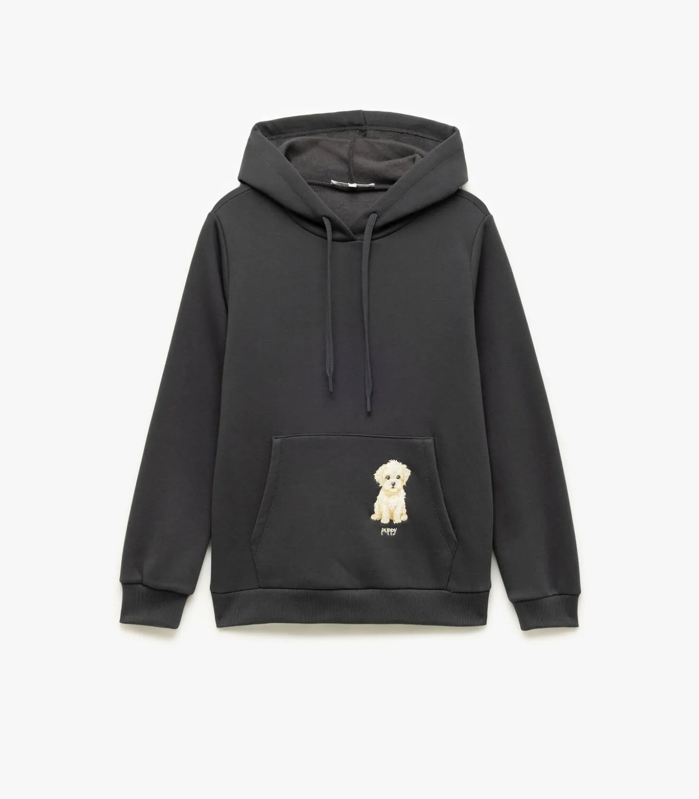 Koton Soft fabric long sleeve hoodie with dog embroidery and kangaroo pocket. Respect Life | This product contains recycled materials. Discover The Respect Life Collection prepared by Koton to leave a more livable world to future generations. This product contains special details such as spangles, paillettes, stones, bead or embroidery. We recommend using your product carefully and sensitively against external physical deformations (shrinkage, tripping, rubbing, etc…).