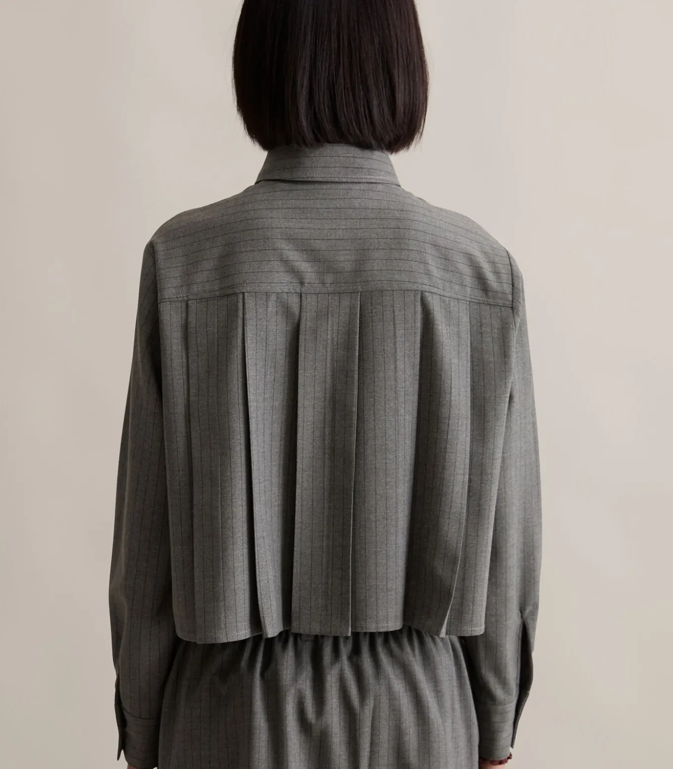 Ook deze herfst/winter is krijtstreep weer een van de belangrijkste trends. Wat vroeger als stoffig werd beschouwd, is nu cool, relaxed en casual. Stukken met een krijtstreepmotief zijn absolute klassiekers die je steeds weer kunt mixen en matchen en die je meerdere seizoenen kunt dragen. Deze strakke blouse van een mix van gerecycled polyester, viscose en elastaan heeft een casual, garengeverfde gestreepte look. Het heeft een eenvoudige voorkant en een verrassende achterkant met brede, wijd uitlopende plooien. Losse, uitlopende regular fit met een Kent kraag, knoopsluiting en lange blousemouwen met manchetten. De blouse heeft het karakter van een set en kan gecombineerd worden met de bijpassende broek of rok.