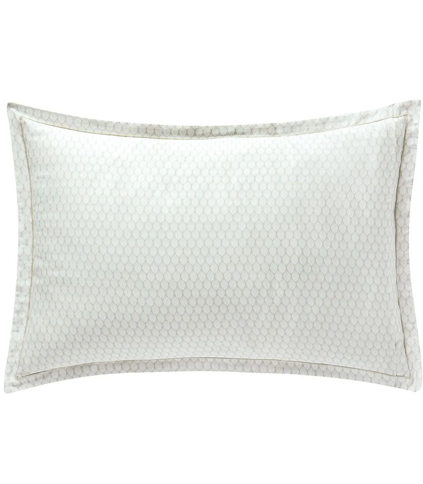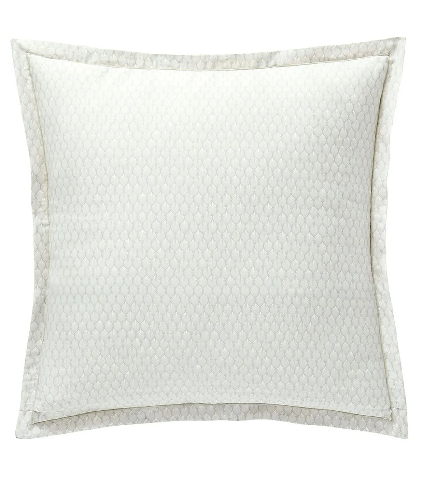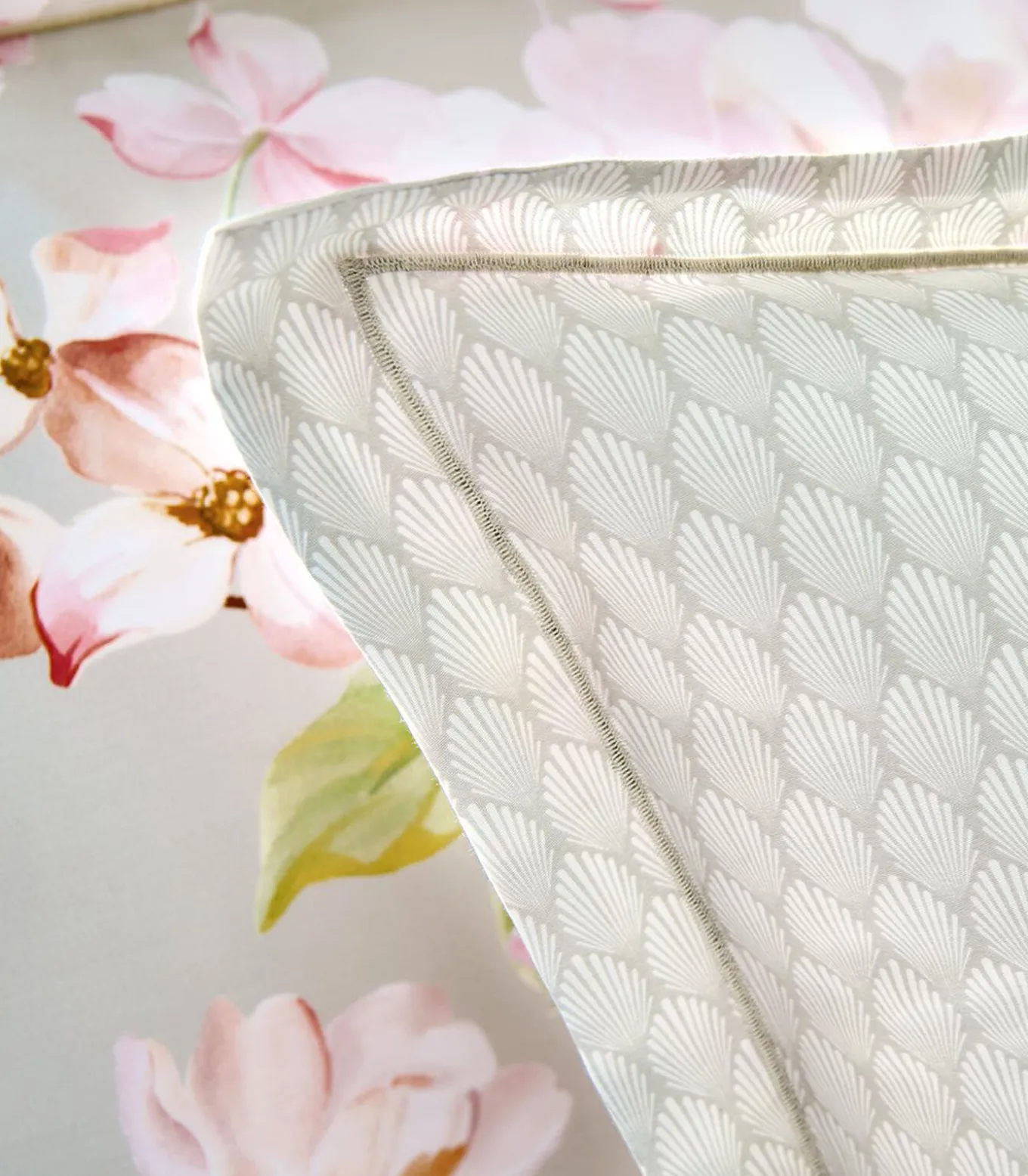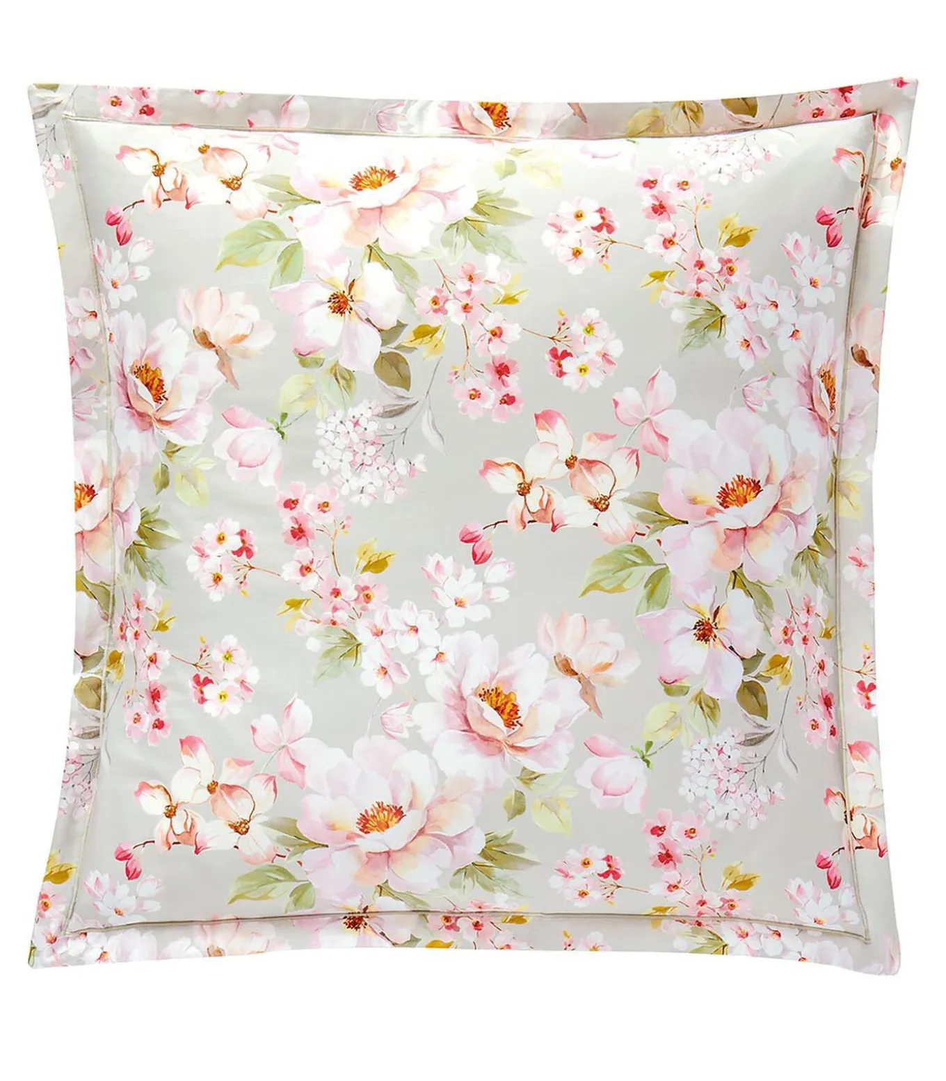 Voorzijde bedrukt met rozen en kersenbloesems op een grègekleurige achtergrond.Achterzijde met palmettenmotief op dezelfde grègetint.Sloop met platte volant van 3 cmAfgewerkt met een fijne grègekleurige bourdonsteek