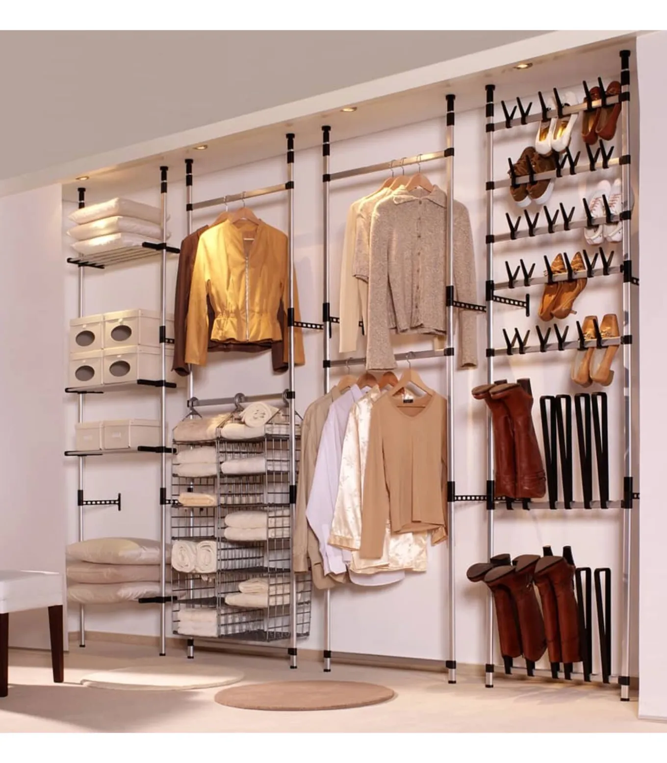Het telescopische laarzenrek is gemaakt van aluminium, waardoor het sterk en stevig is. Dit opbergrek kan worden aangepast aan verschillende ruimtelijke opstellingen, dankzij het telescopische systeem en de verstelbare hoogte. Het systeem biedt een unieke en veelzijdige manier om laarzen te organiseren en ruimte te besparen.