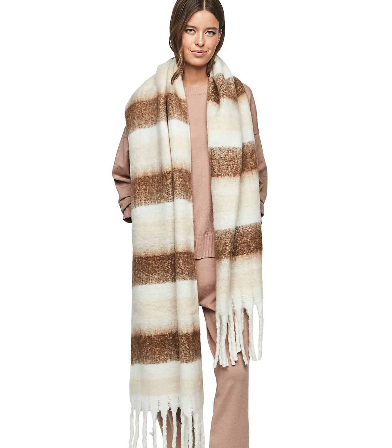 Ultrazachte sjaal, ideaal om je warm te houden in de winter. Hij is zeer comfortabel en beschermt je nek tegen wind en kou. Het gestreepte kleurverloop geeft je een stijlvolle look voor je winterdagen. Vloeiende franjes aan de uiteinden.[Sjaal apart verkrijgbaar. Kleding en andere accessoires die het model op de foto’s draagt, zijn niet inbegrepen].