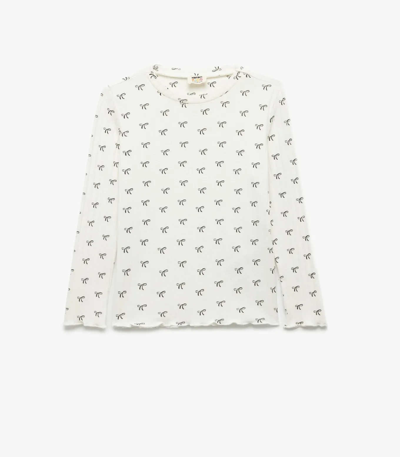 Dit charmante T–shirt voor meisjes, met lange mouwen en een ronde hals, is versierd met een speels strikpatroon. Het is ontworpen voor dagelijks comfort en voegt een schattig detail toe aan elke outfit. Perfect voor zowel school als ontspanning.