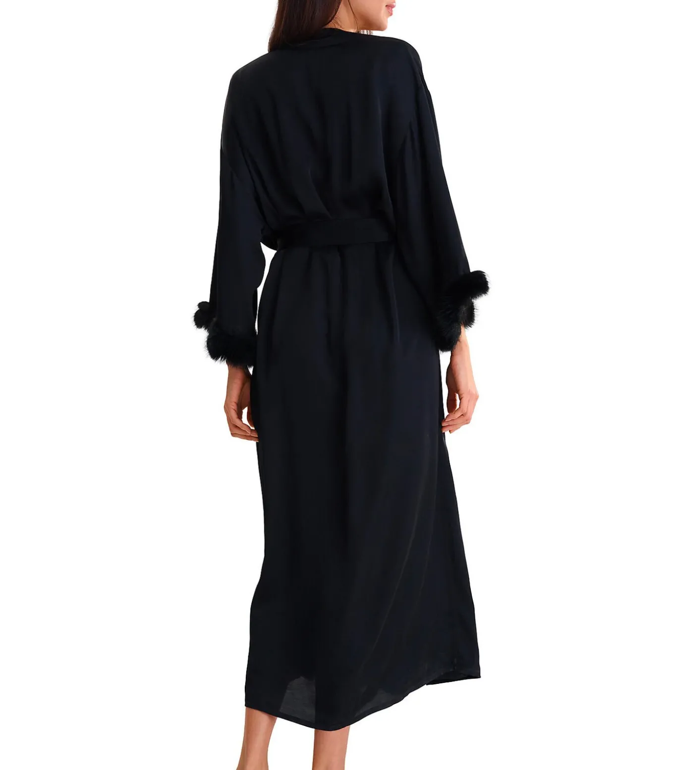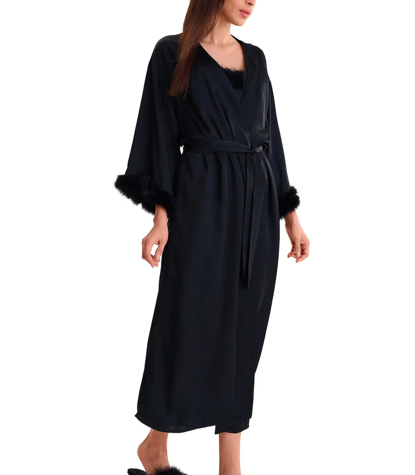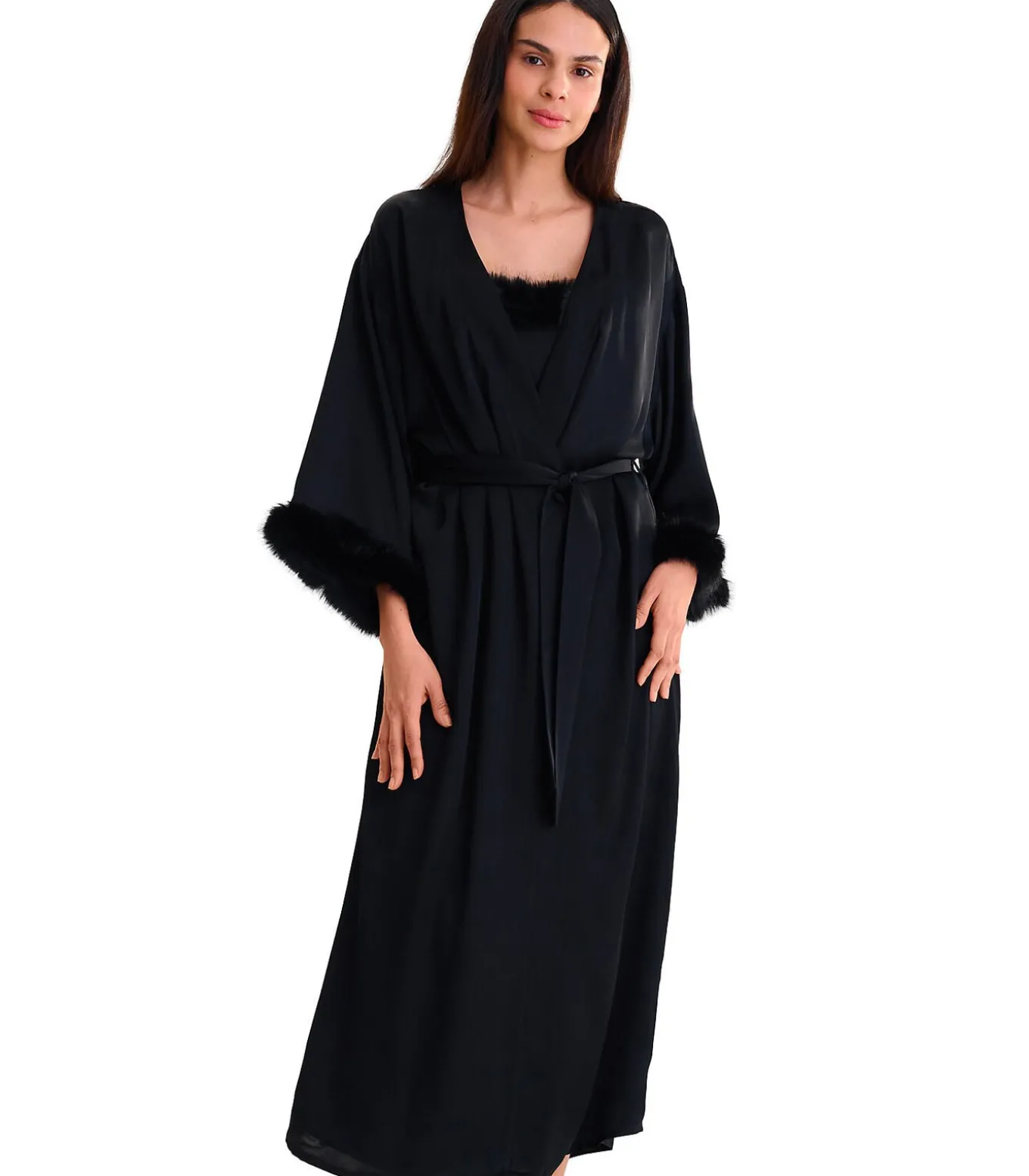 Elegante lange negligé met een losse pasvorm en wijde mouwen versierd met een bontrand. De halslijn is afgewerkt met een zoom over de hele lengte aan de voorkant. Het kan open gedragen worden, of gesloten met een ceintuur om in de taille vast te knopen. Lengte ca. 130 cm.
