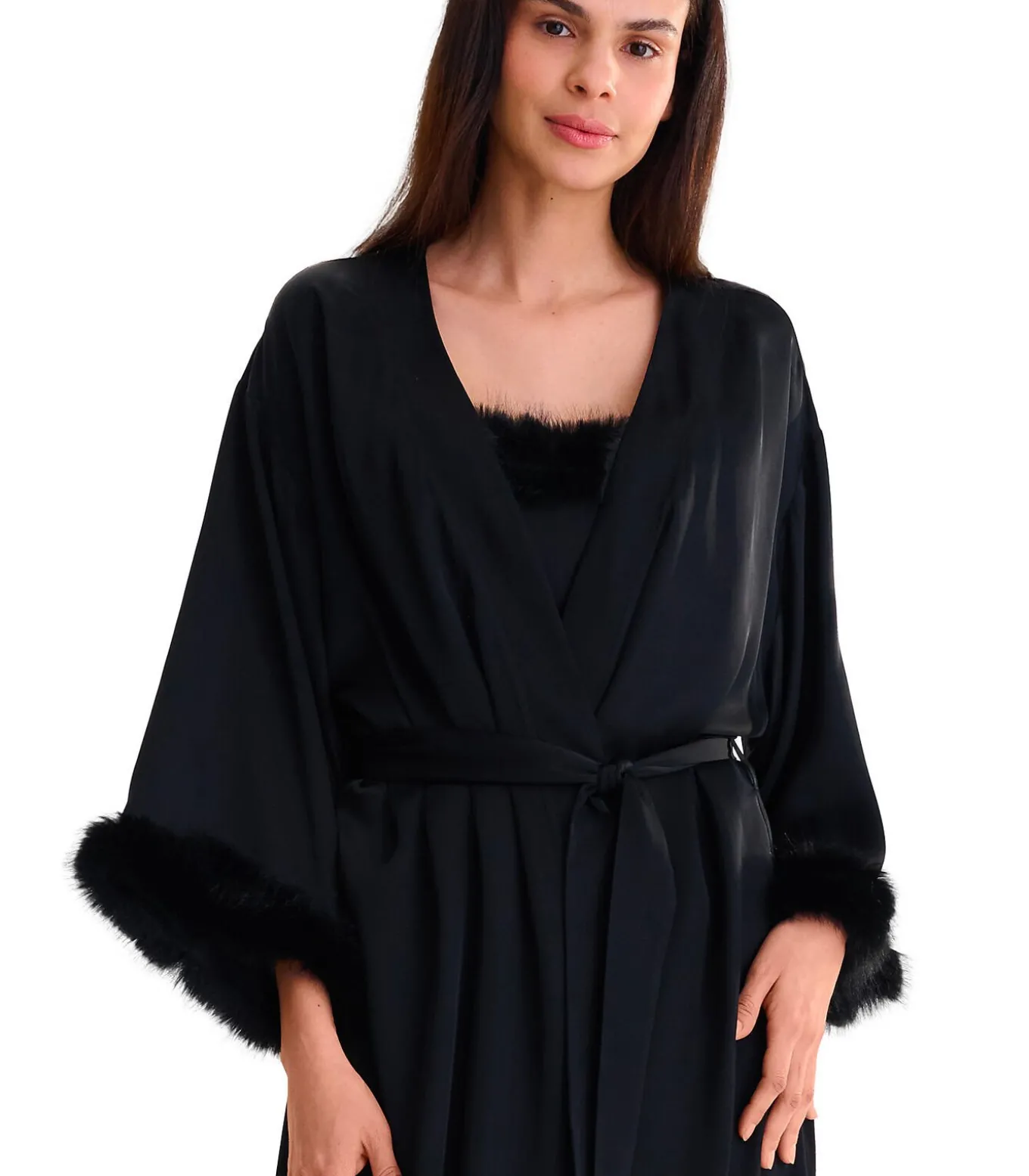 Een comfortabele, geraffineerde nachtcollectie met strakke, eenvoudige lijnen, gemaakt van een licht glanzende viscosestof. De mouwen en hals zijn afgewerkt met zacht bont. Het contrast tussen de gladde stof en de pluizige streep zorgt voor een esthetisch aantrekkelijke uitstraling.[Jurk wordt apart verkocht. Babydoll, lingerie en andere accessoires die het model op de foto’s draagt, zijn niet inbegrepen].