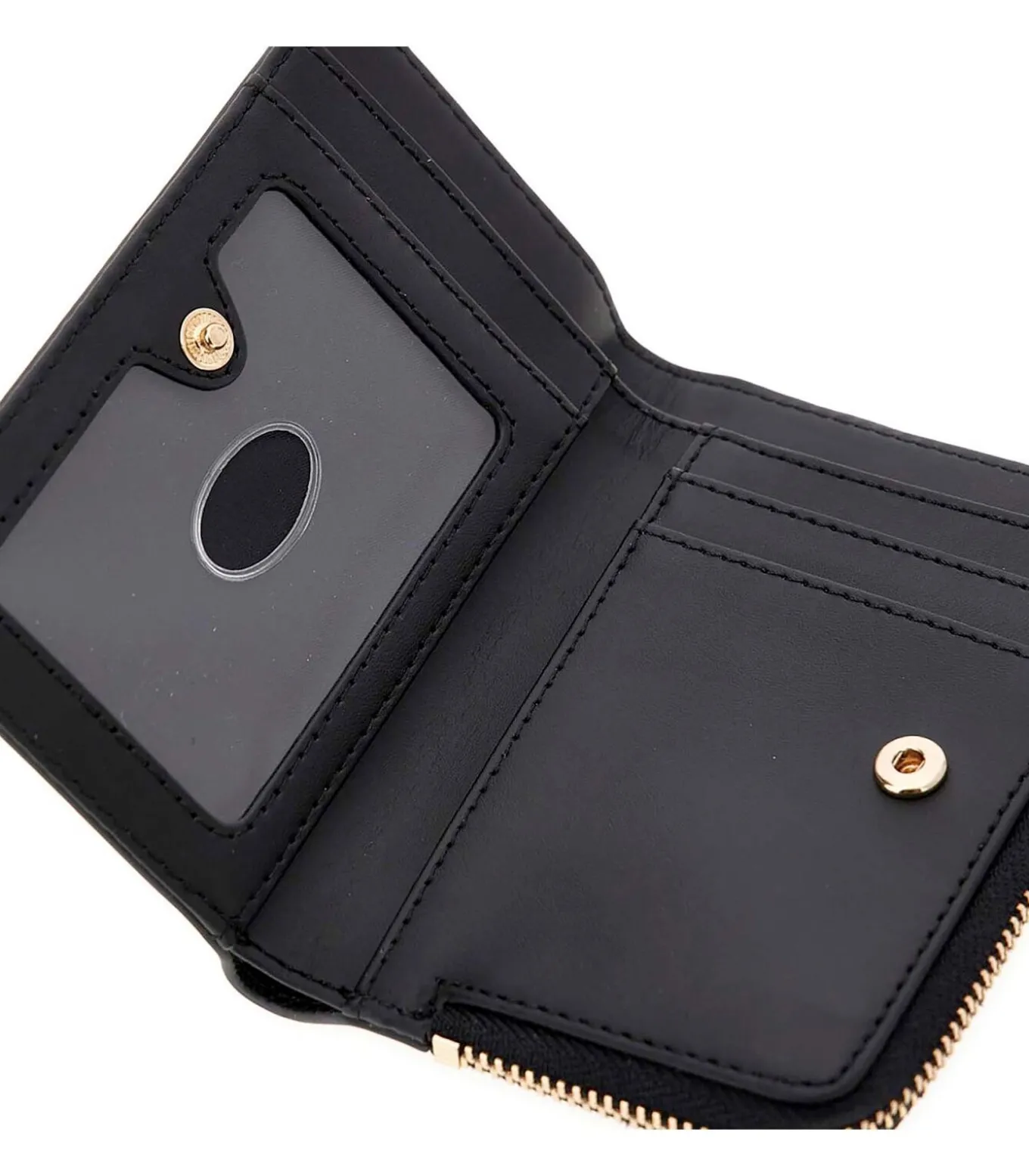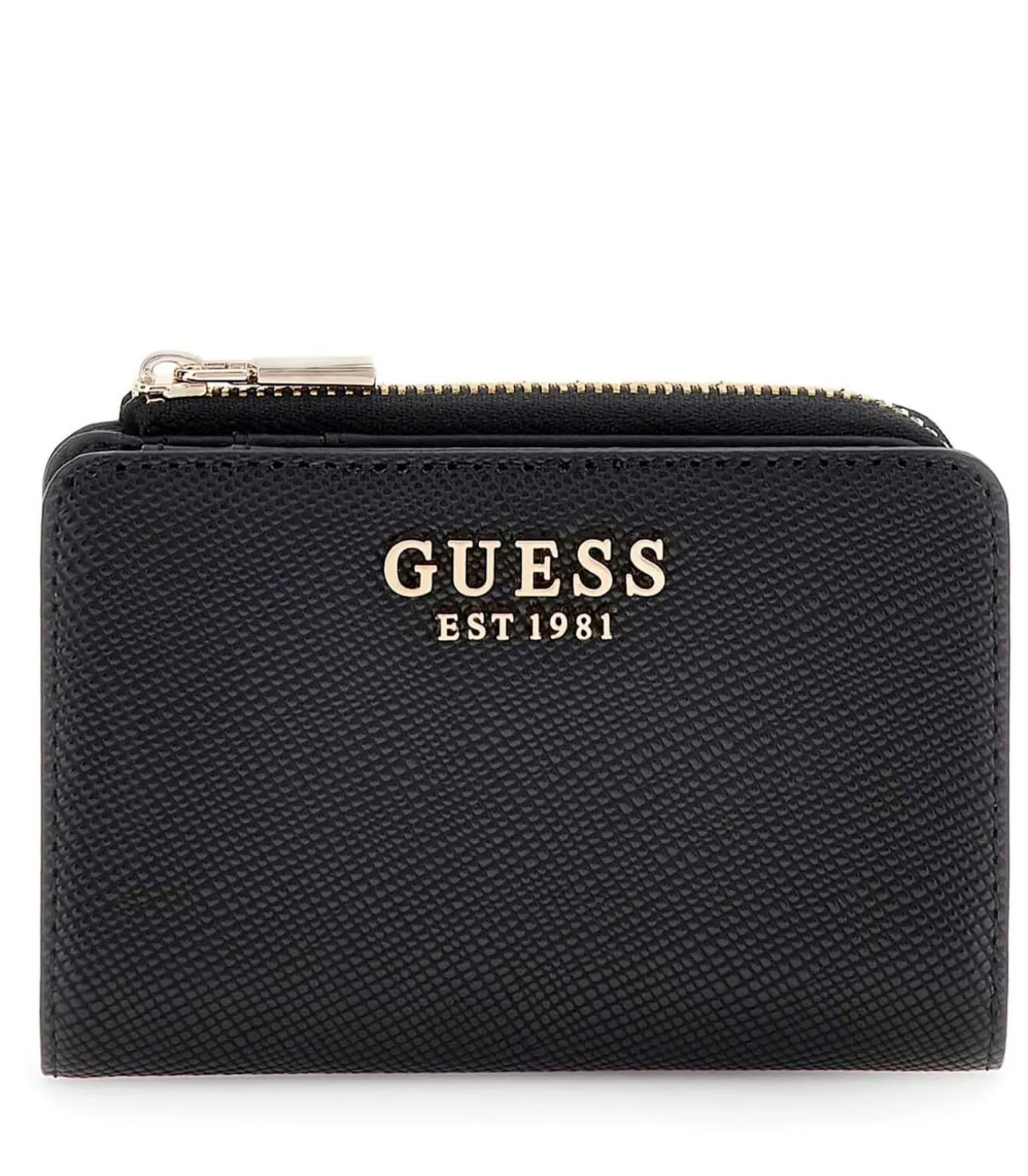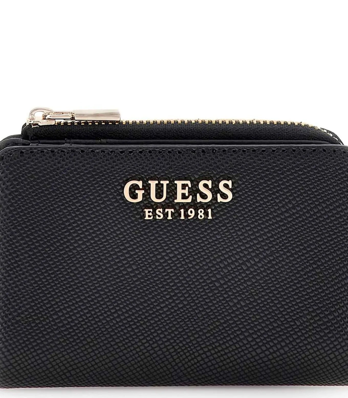 Kleur: Zwart Samenstelling: 100% Polyurethaan Sluiting: Rits Afmetingen: 12 x 8 x 2 cm Details: Saffiano leer, creditcardvak, metalen logo–opschrift op de voorkant, lichtgoudkleurige hardware