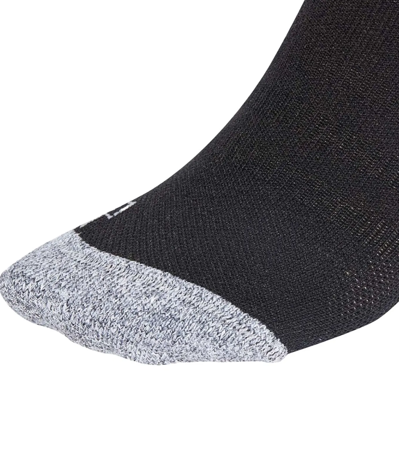 Adidas zwarte sokken met logo, gemaakt van 49% gerecycled nylon en 48% gerecycled polyester met 3% elastaan. Het materiaal is gebreid. Het ontwerp heeft een chevron– en tweekleurig patroon met het Adidas logo. Deze sokken hebben Heat.Rdy technologie, waardoor ze snel droog worden. Ze hebben een middenkuit snit, met gewatteerde hak en teen.