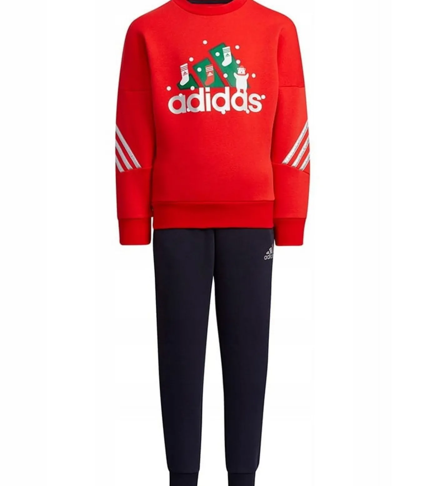 Adidas Trainingset met logo in donkerrood, bestaande uit een broekje en een sweater. Het trainingset is gemaakt van 70% katoen en 30% polyester, waarbij de stof zacht aanraking biedt. De ontwerpen bevatten logo’s, ijsberen, sneeuw, sokken en streepdetails. Het trainingset beschikt over twee zijzakken en heeft een crew neck hals. Het zoom is gerimpeld, de waaierlijn is elastiek en het type mouw is met lange mouwen. Het kan als pull–over of pull–on gedragen worden. Deze set maakt deel uit van de kerstmis collectie.