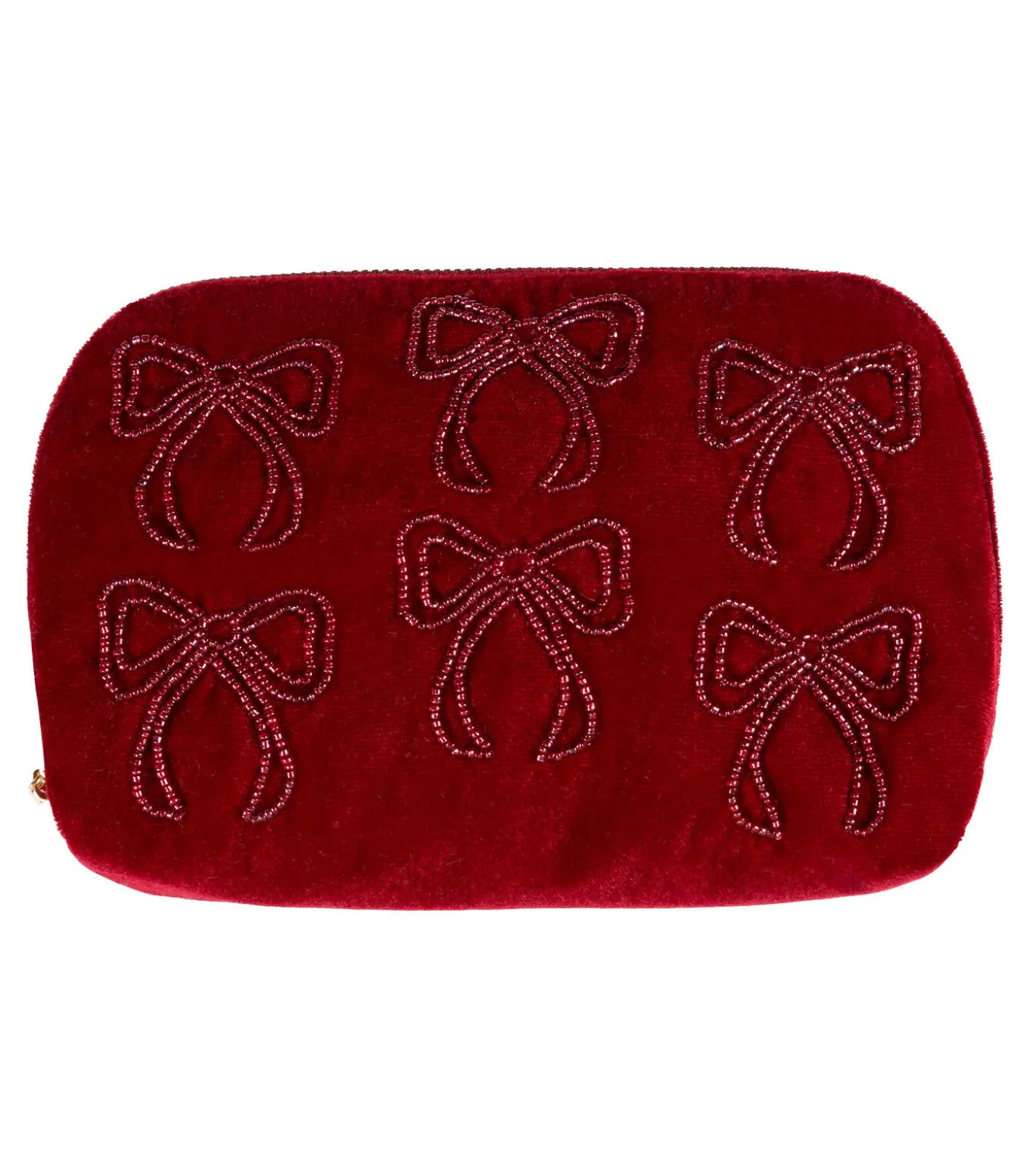 Voeg wat glans toe aan je beautyroutine met dit schattige make–uptasje, versierd met delicate strikjes voor een speelse, maar toch verfijnde afwerking. Hij is ontworpen om je dagelijkse benodigdheden in op te bergen en geeft je beautycase of handtas wat extra charme.