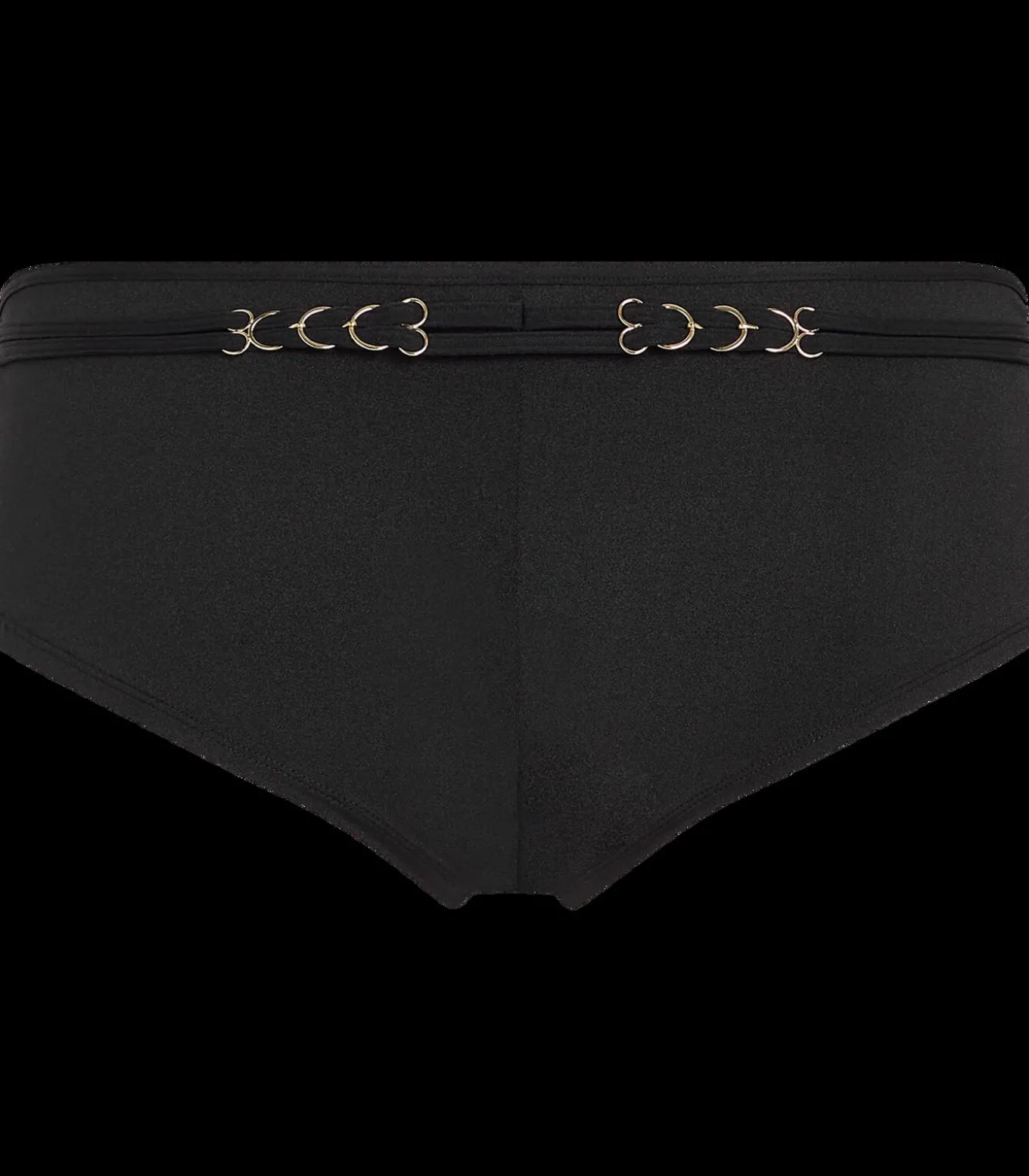 Met zijkanten van 12 cm biedt deze stijlvolle brazilian short medium bedekking en vormt hij subtiel je silhouet. Het goudkleurige ornament aan de achterkant, geïnspireerd op Mirabai’s manjira (handcymbalen), zorgt voor een krachtig en opvallend detail. Deze pasvorm onthult het onderste deel van je billen en je buik — de perfecte balans tussen comfort en verleiding.