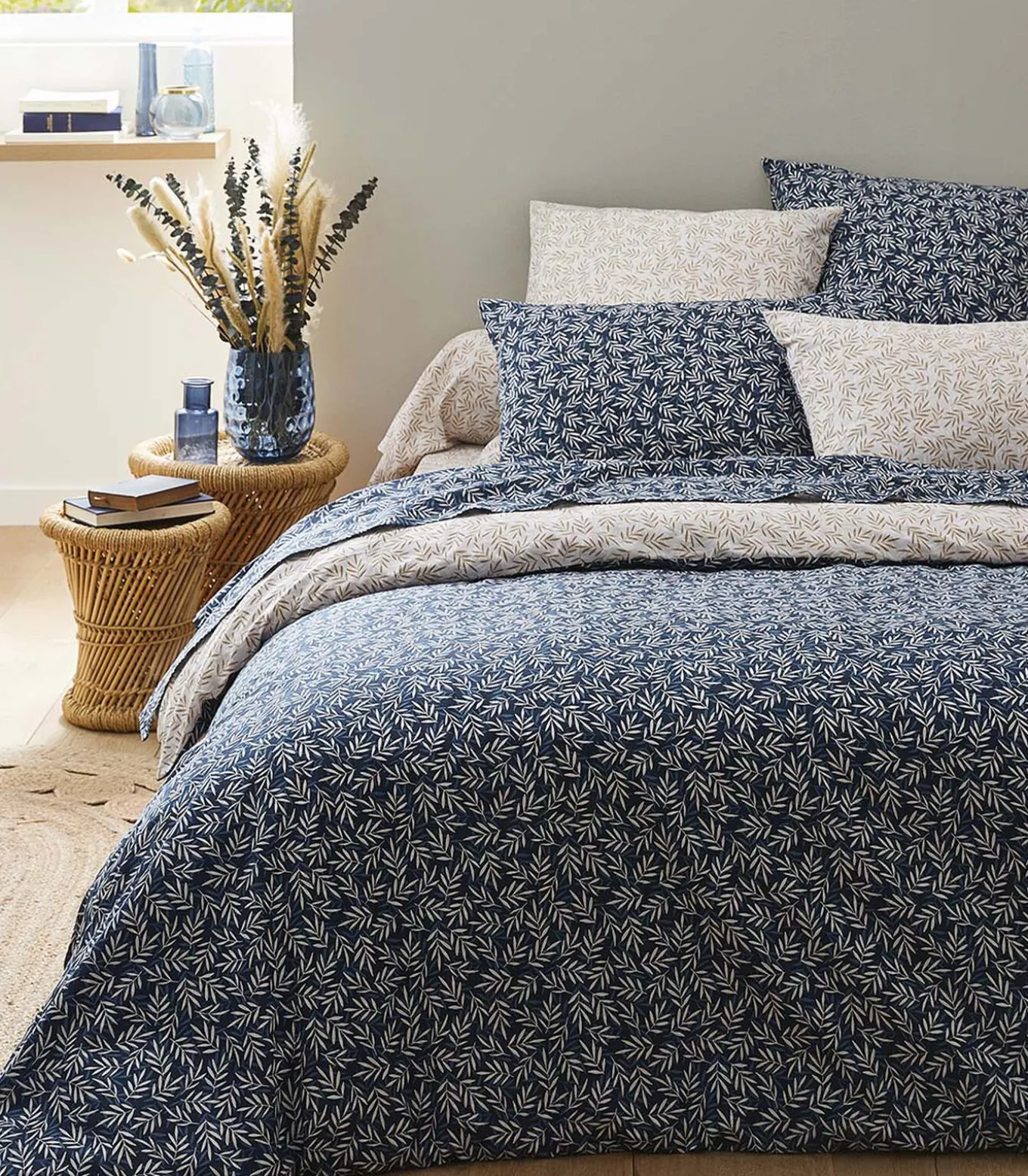 Margot zal je verleiden met haar verfijnde en pure wereld van gebladerte. Met deze twee kleurvarianten kunt je de sfeer naar wens aanpassen! Dit model is omkeerbaar: je kunt kiezen tussen de beige of de blauwe kant.