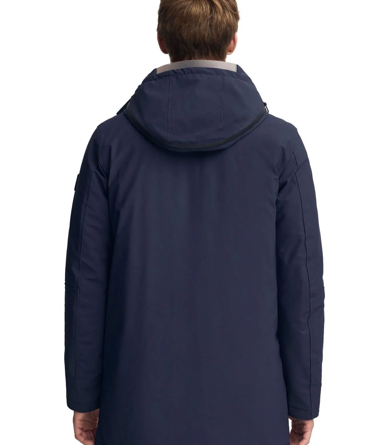 Lange gewatteerde herenjas met capuchon. De capuchon heeft een reflecterend detail verzegeld met een ritssluiting en elastische ritstrekker met logo, verstelbare stoppers, plus een doorzichtige vizier. De hoofdritssluiting wordt afgedekt door een flap met magnetische knopen, waardoor de jas heel goed wordt afgesloten. De twee zijzakken en binnenzakken, allemaal met thermisch verzegelde ritsen, bieden veilige opbergruimte. De binnenkant is licht gewatteerd, zodat de lichaamstemperatuur vastgehouden wordt. De jas is waterafstotend, winddicht, ademend en comfortabel dankzij de gebruikte materialen.