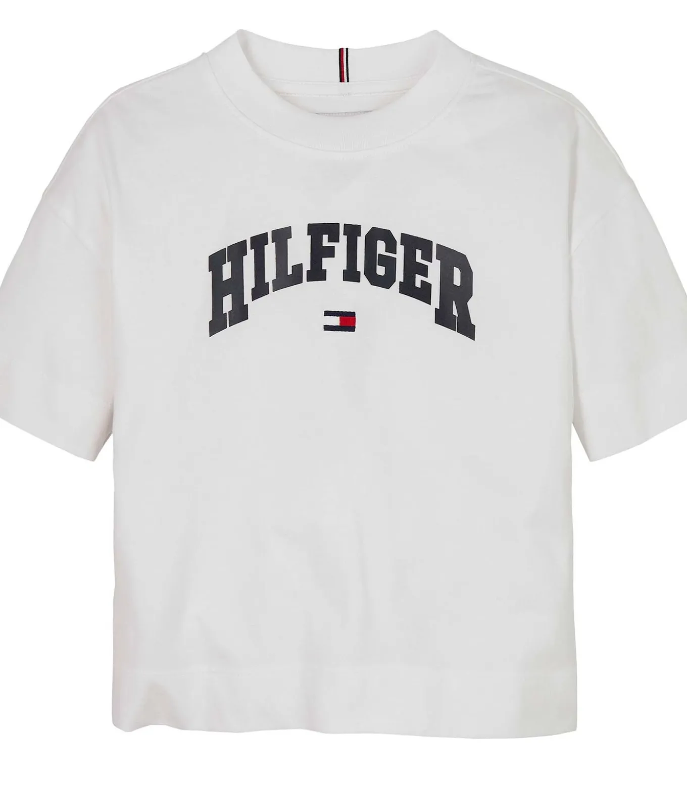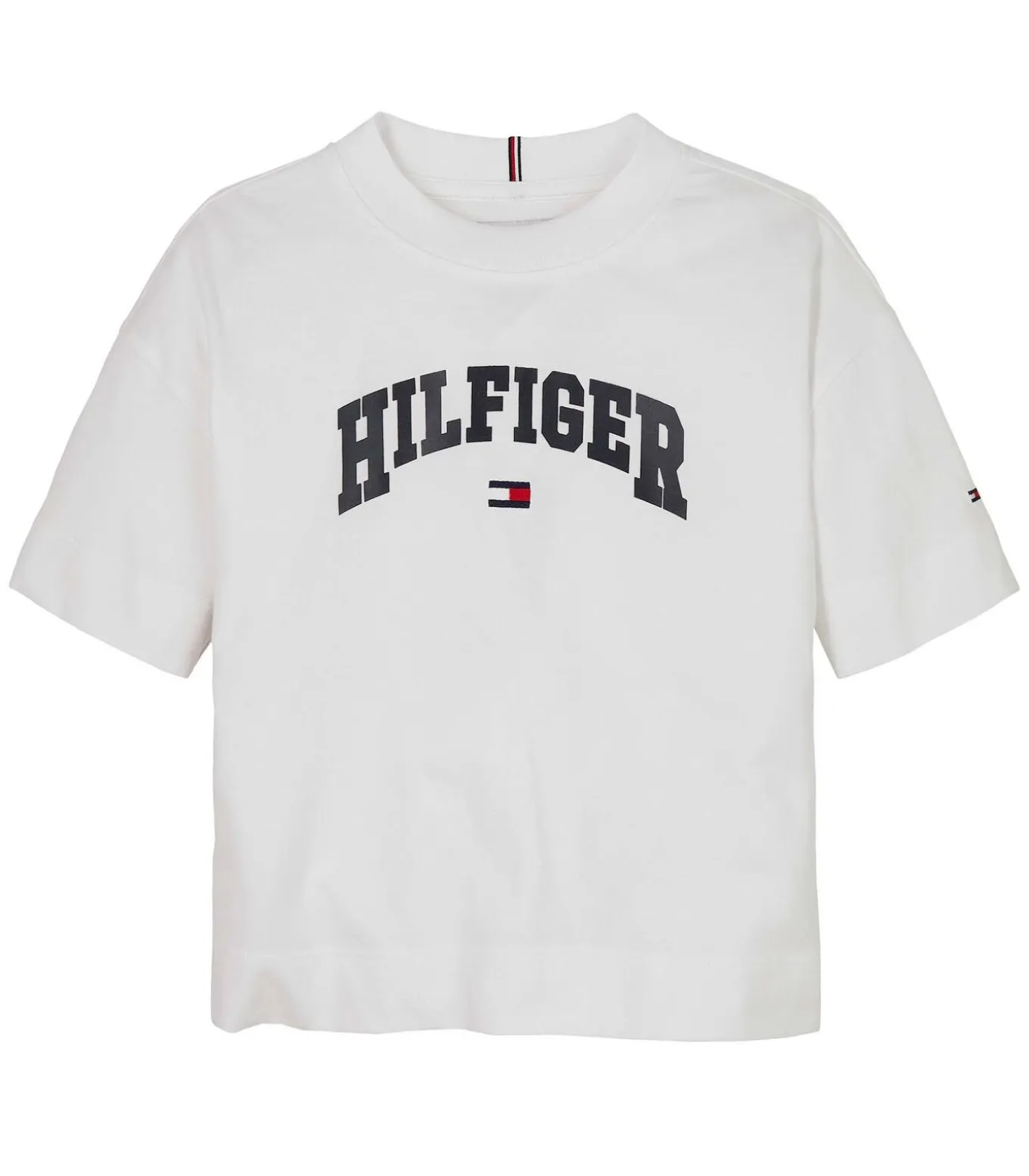 Kleur: Wit Samenstelling: 100% katoen Mouwen: Kort Halslijn: Ronde hals Pasvorm: Normaal Details: T–shirt van puur katoen met een Tommy Hilfiger–logo in collegestijl op de borst. Afgewerkt met kenmerkende tape in de nek en een geborduurde vlag op de mouw voor een sportieve en authentieke look. Gebruik: Ideaal voor school en vrije tijd, perfect voor casual looks met een collegegevoel