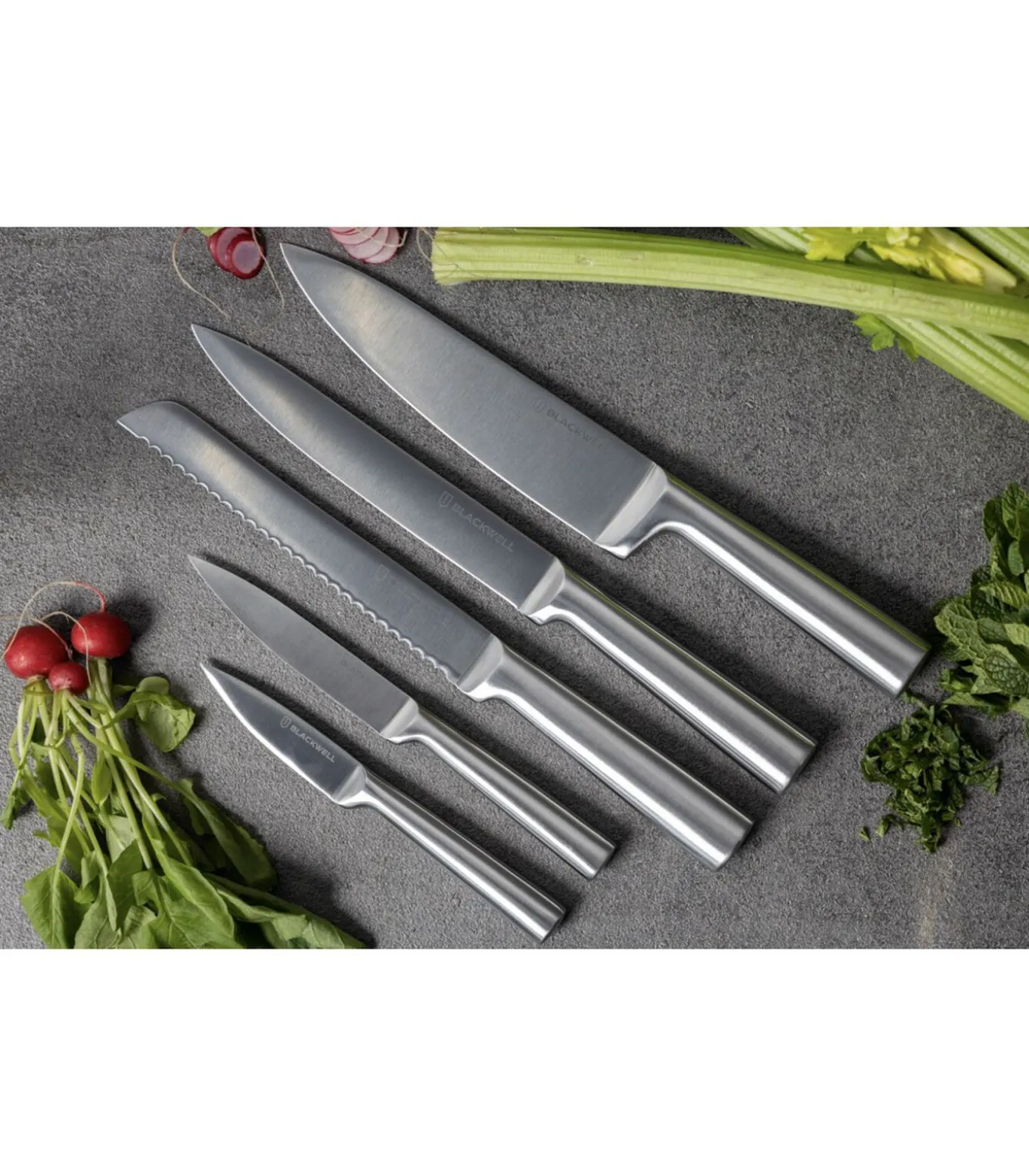 Het juist opbergen van messen in de keuken is niet alleen goed voor de veiligheid, maar ook voor het mes zelf. Het snijvlak van het mes blijft goed beschermd in een messenmagneet en messenblok. Met dit Blackwell messenblok heb je alle benodigde keukenmessen in één set, welke je in het meegeleverde messenblok op je aanrechtblad kunt plaatsen. Deze set bestaat uit een chique, houten messenblok met de volgende messen:Blackwell koksmes 21 cm (totale lengte 34.5 cm)Blackwell broodmes 21 cm (totale lengte 33.5 cm)Blackwell vleesmes 21 cm (totale lengte 33.5 cm)Blackwell officemes 12 cm (totale lengte 23 cm)Blackwell schilmes 18 cm (totale lengte 20 cm)Deze vlijmscherpe messen zijn gemaakt van X45CrMoV15 staal en zijn daardoor roestvast. De lange krop biedt bescherming voor je hand tijdens het snijden. De messen van Blackwell kunnen na gebruik gereinigd worden in de vaatwasser.