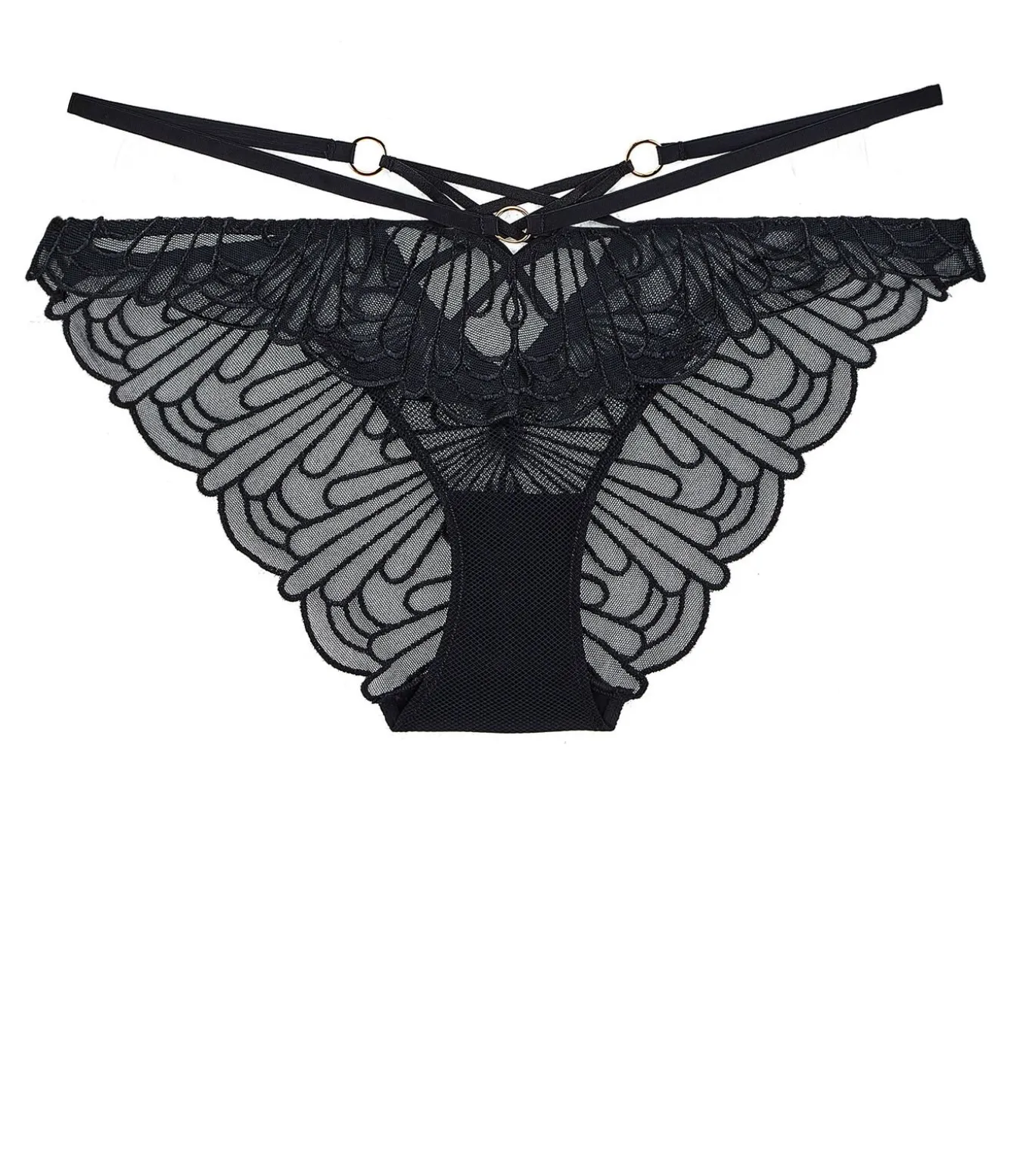 De bij de billen licht uitgesneden minitanga benadrukt de vrouwelijke welvingen door te spelen met diepzwart kant, uitsnijdingen met structuur en de afneembare gevlochten tailleband.