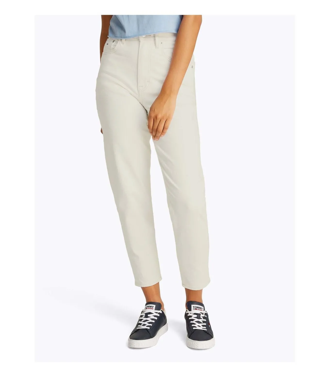 * Kleur: Denim White * Samenstelling: 99% katoen, 1% elastaan * Pasvorm: Regular fit * Pasvorm: Taps toelopende mom fit * Taille: Zeer hoog * Sluiting: Rits en knoop * Details: Stretchkatoenen denim, lichte wassing, five–pocket–model, Tommy Jeans–vlagpatch op het muntzakje en op de achterzak * Gebruik: Perfect voor een retro en veelzijdige look, deze mom fit jeans met zeer hoge taille slankt het silhouet af en is gemakkelijk te combineren met cropped tops of shirts voor een casual chique outfit.