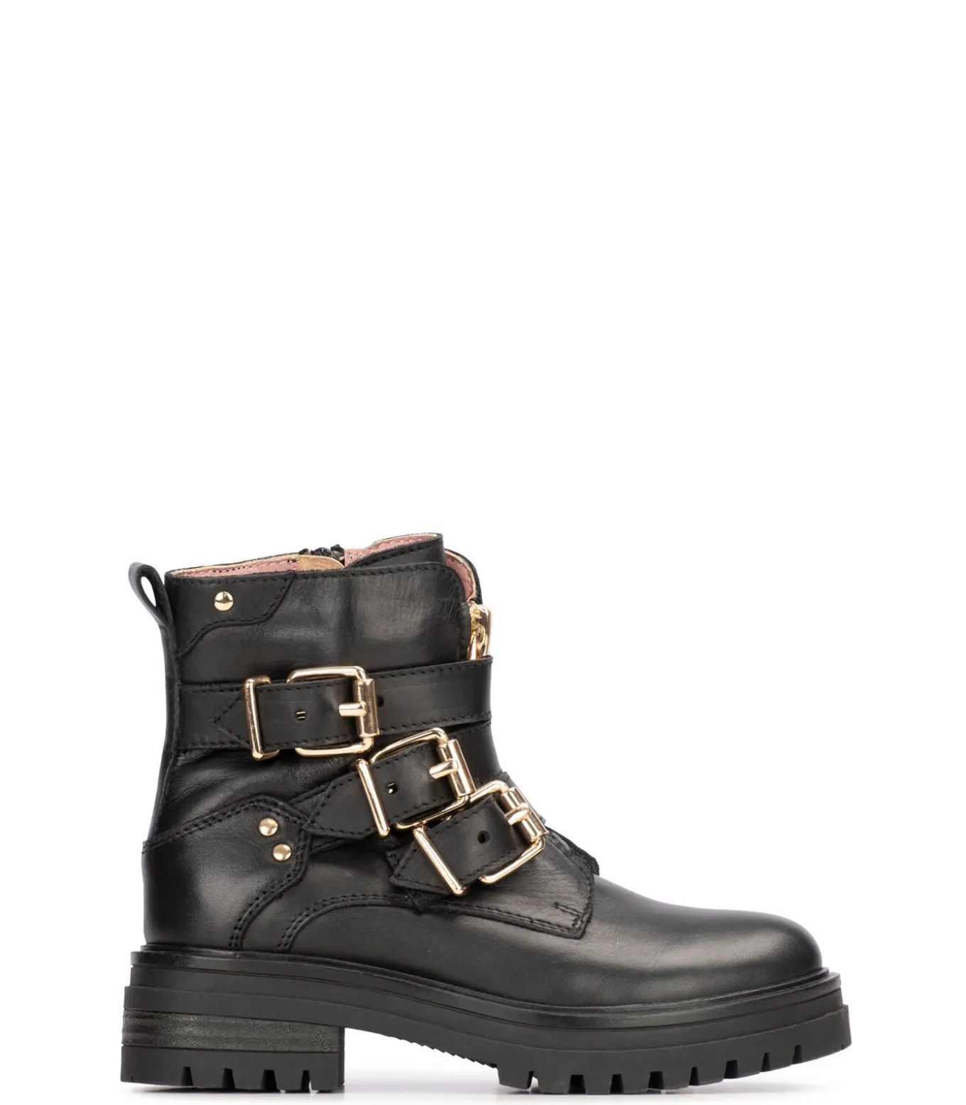 Deze MONK enkellaarzen voor meisjes van PS Poelman hebben een bovenwerk van zwart leer met gouden details. Het model is voorzien van een ritssluiting een een blokhak met hoogte van 4 cm. De laarsjes hebben een binnenvoering van textiel en een vast voetbed.