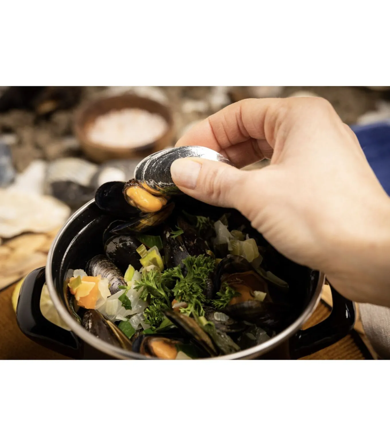 Bent u een ware liefhebber van verse mosselen? Dan mag het chique Anovi mosselbestek zeker weten niet ontbreken op uw tafel. Dit Zeeuws bestek is vervaardigd uit hoogwaardig gepolijst zilvertin en is ook nog eens ambachtelijk vervaardigd in Nederland. Door het speciale veertje werkt het mosselbestek hetzelfde als een echte mosselschelp, waardoor u eenvoudig mossels vanuit de schelp kunt nuttigen! Om de uitstraling compleet te maken, lijkt dit bestek op een echte mossel. Het perfecte geschenk om cadeau te geven is toch wel het stijlvolle Anovi mosselbestek.