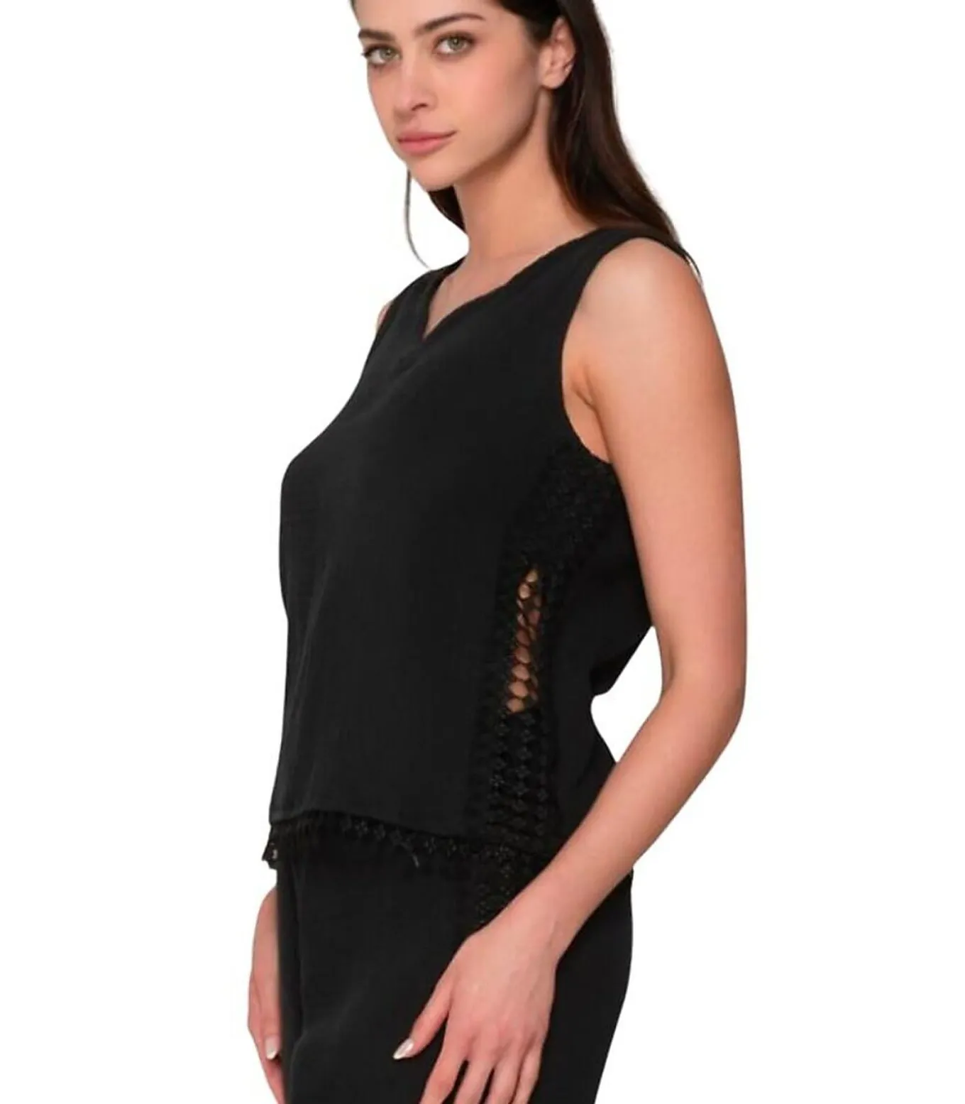 Deze mouwloze top is gemaakt van een lichtgewicht katoenen stof met een reliëfstructuur. Het heeft een eenvoudige, elegante V–halslijn. De zijkanten en zoom zijn versierd met delicate macramédetails die een vleugje verfijning en vrouwelijkheid aan het ensemble toevoegen. De stijl is zowel casual als chic, perfect voor zomerse dagen.[Top apart verkrijgbaar. Het broekje, de sieraden en andere accessoires die het model op de foto’s draagt, zijn niet inbegrepen].