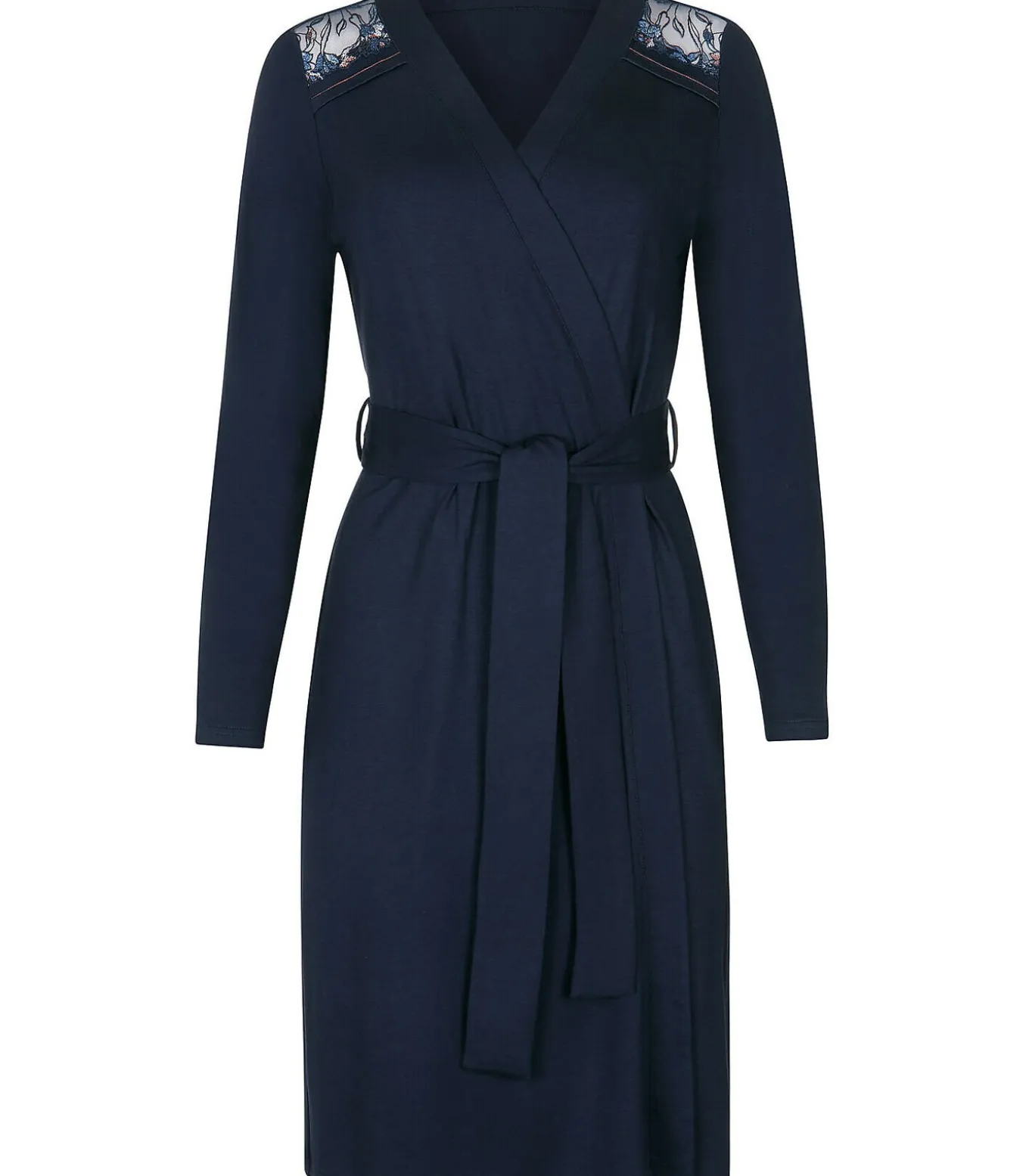 Damespyjama van comfortabel Vortex viscosebreisel met geborduurde inzetstukken. De stof voelt verfijnd aan en valt mooi; het zachte, comfortabele viscosebreisel voelt aan als een tweede huid. Modern en elegant, vrouwelijk en verleidelijk, maar toch verfijnd, praktisch en comfortabel. Het bloemenborduursel is licht en luchtig en accentueert de decoratieve plooi met kleurrijke stiksels. Verkrijgbaar in twee kleuren: de zachte kleur van een kus in bloei en de kleur van een blauwe schemering.[Jurk wordt apart verkocht. Nachtpon, schoenen en andere accessoires die het model op de foto’s draagt, zijn niet inbegrepen].