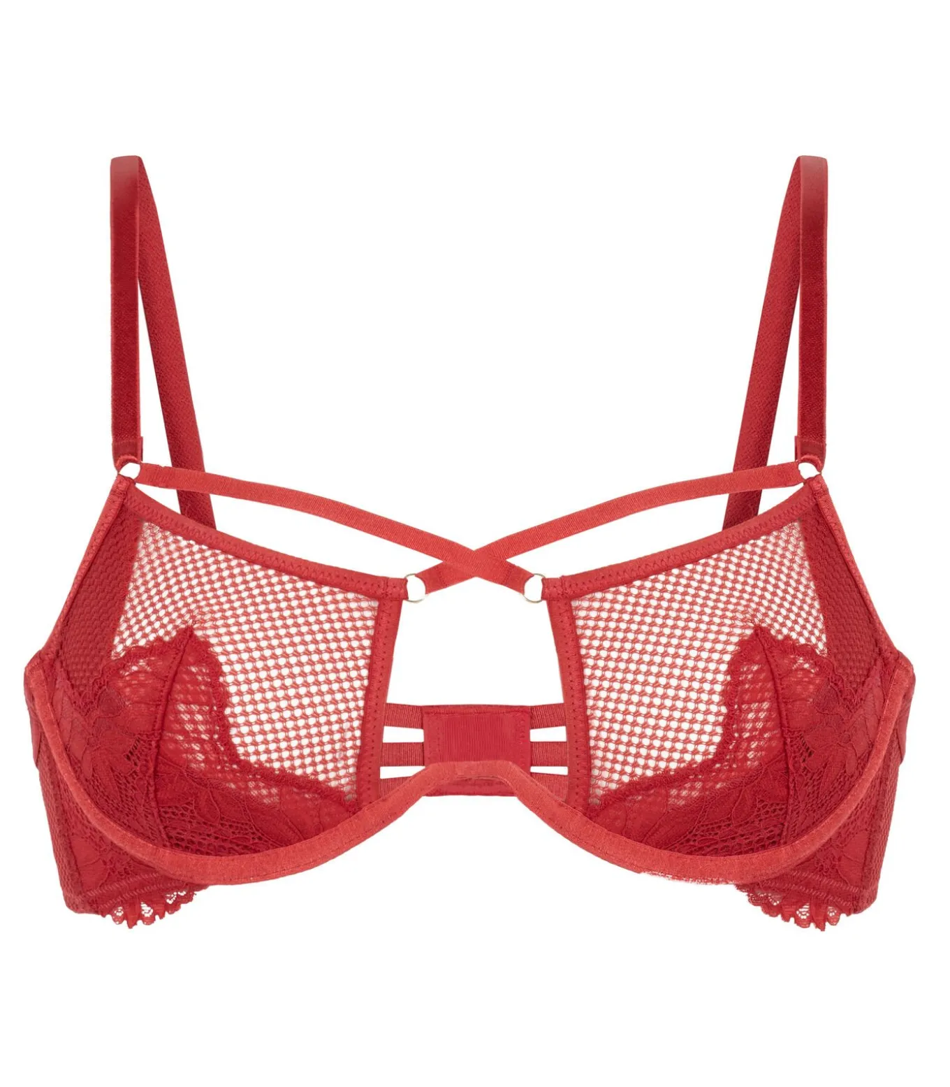 Deze niet–voorgevormde beugel bh is ontworpen om een statement te maken en combineert een gedurfd design met verfijnde details. De gestructureerde cups zorgen voor een natuurlijke vorm en ondersteuning, terwijl de combinatie van visnetstof en kant voor een opvallend contrast zorgt.Combineer hem met de bijpassende string voor een complete look.